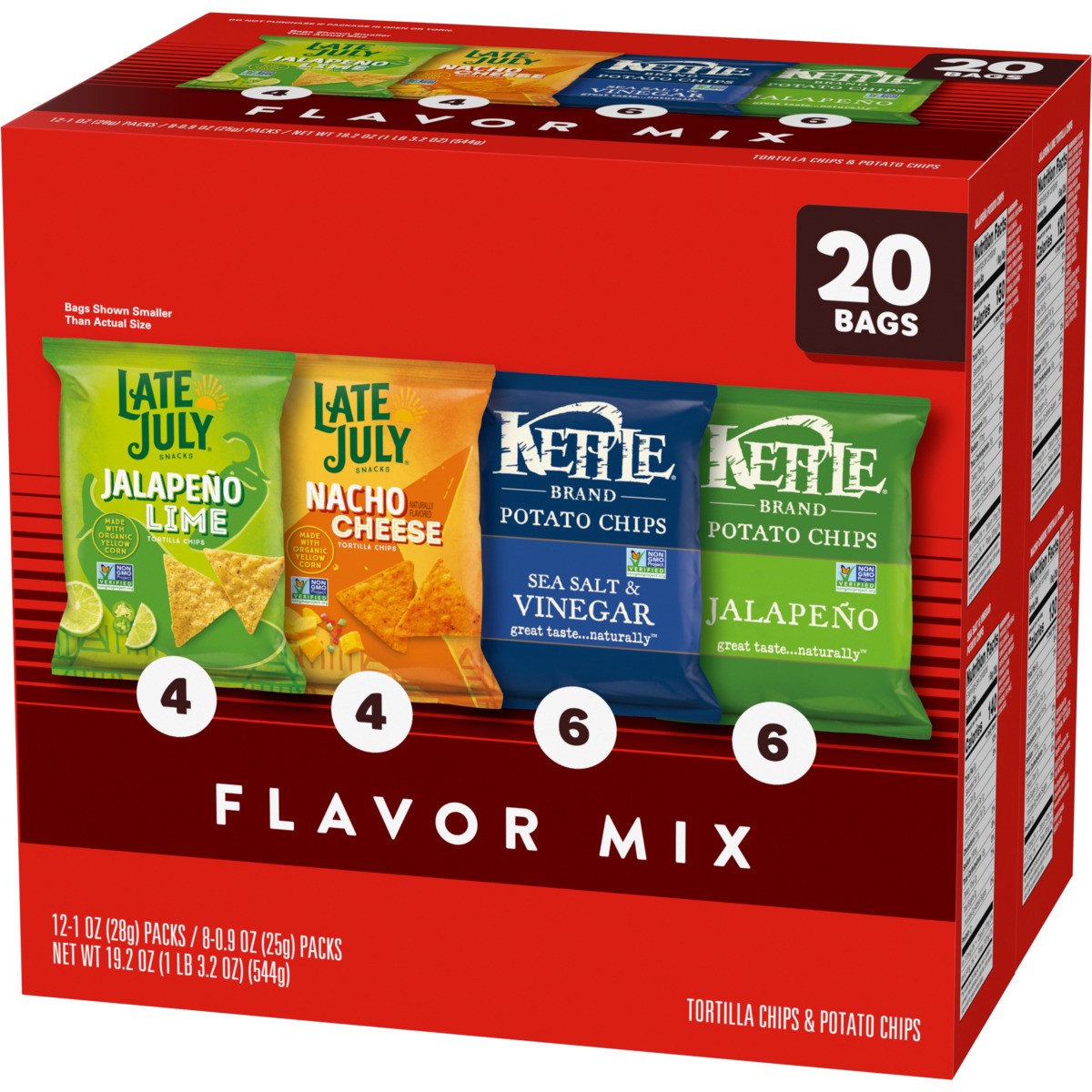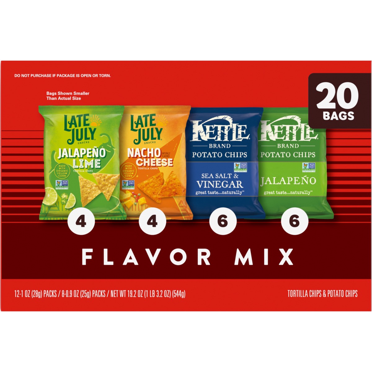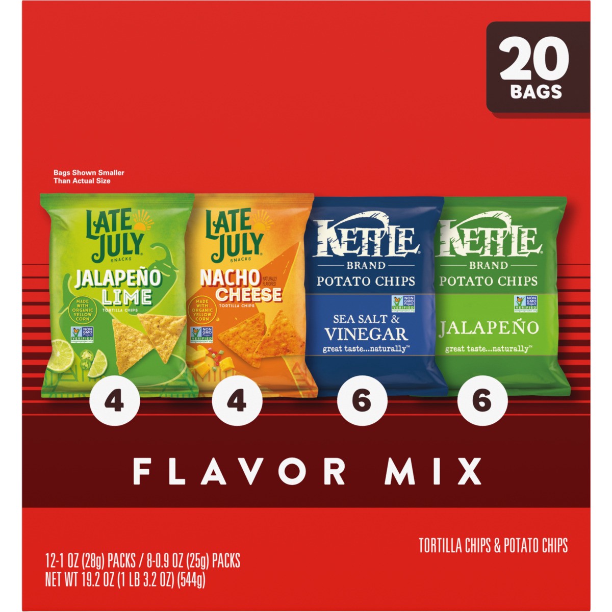 Get a variety of Kettle Brand and Late July chips in our delicious 20-count variety pack, including: Kettle Brand Jalapeño Potato Chips, Kettle Brand Sea Salt & Vinegar Potato Chips, Late July Nacho C…