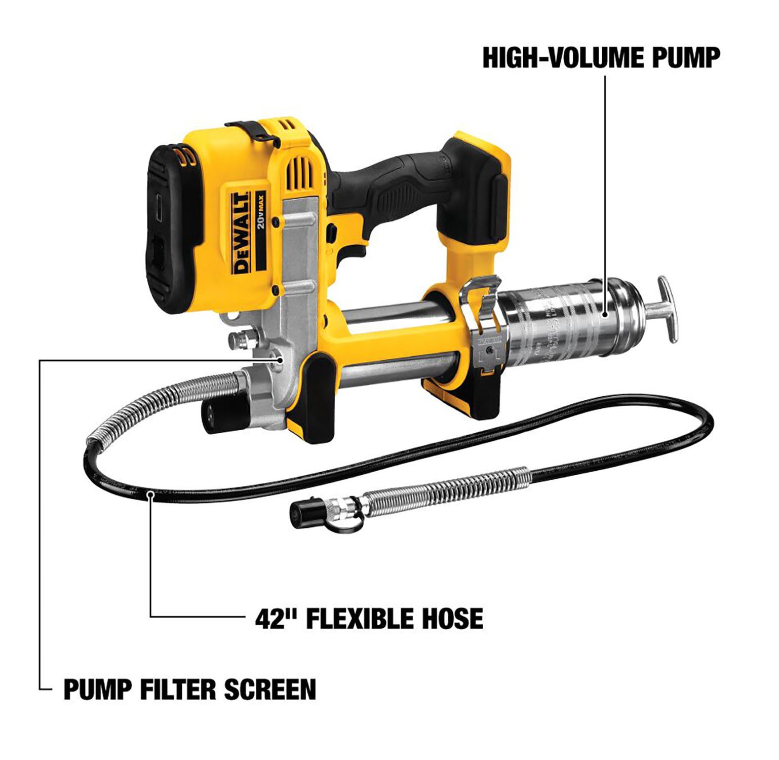 Powerful motor delivers 10,000 max PSI to power through clogged grease fittings. High-volume pump pushes up to 5.0 oz/min high-flow applications. Up to 16 cartridges per charge with a single DEWALT 20…