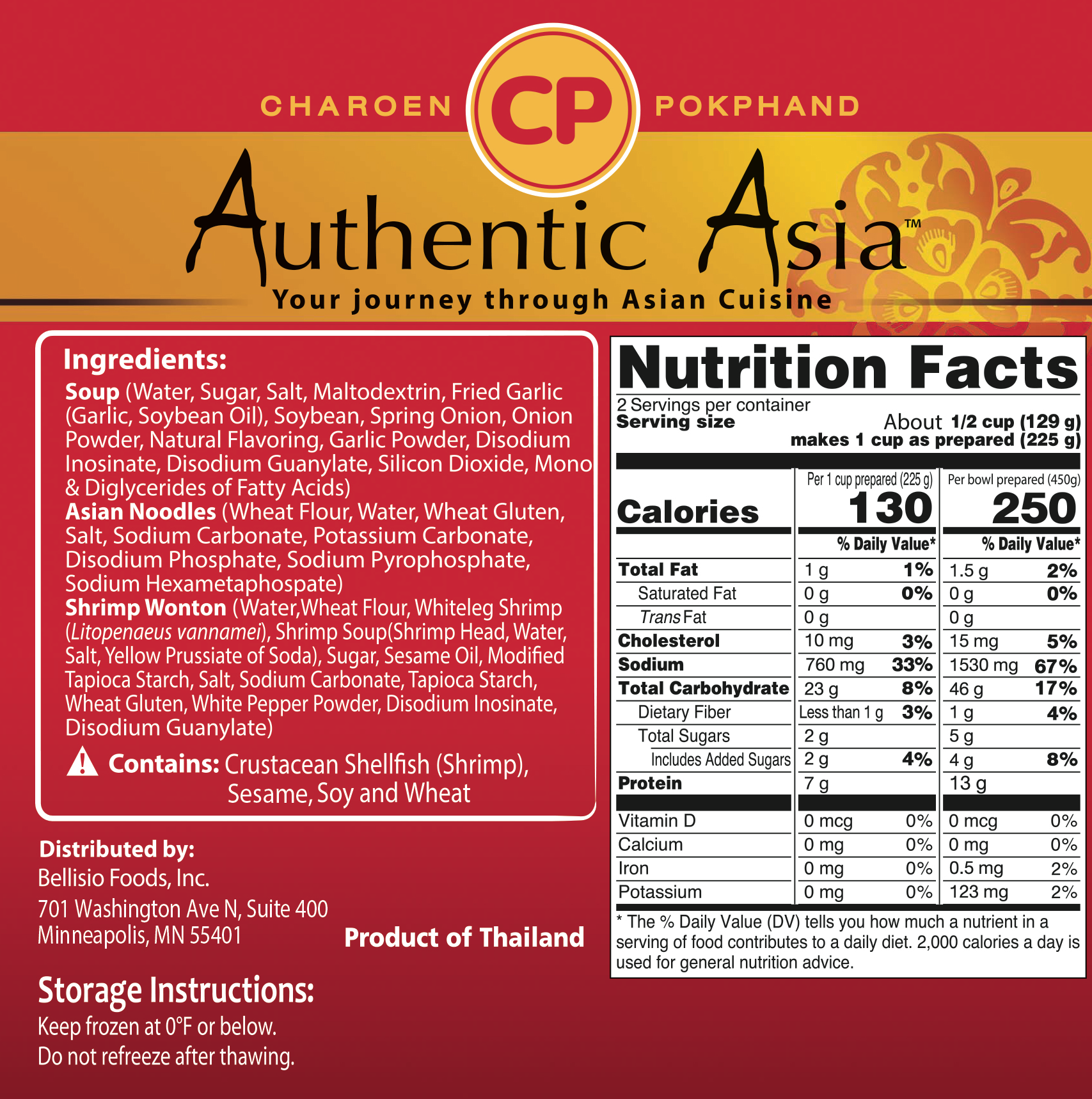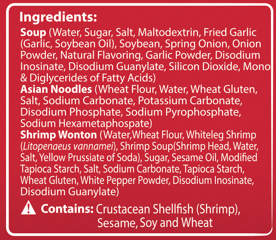 Asian Noodles: (Wheat Flour, Water, Wheat Gluten, Salt, Sodium Carbonate, Potassium Carbonate, Disodium Phosphate, Sodium Pyrophosphate, Sodium Hexametaphosphate. Shrimp Wonton: Whiteleg Shrimp (Litop…