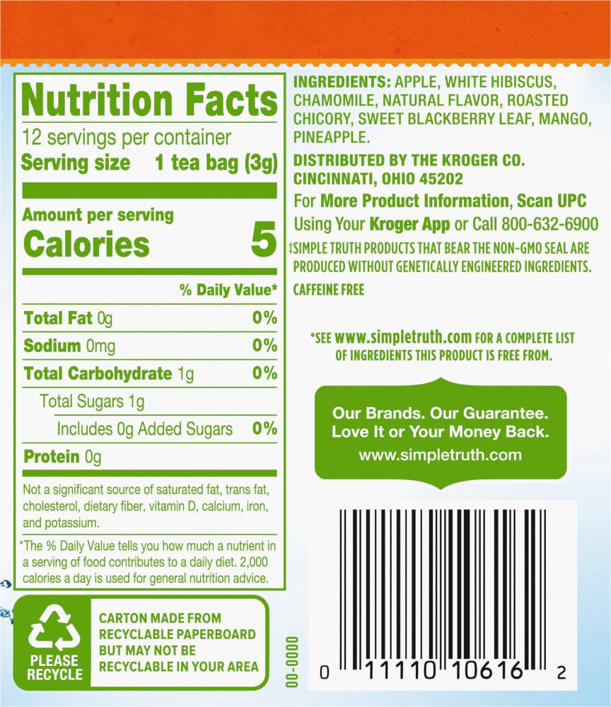 Apple, White Hibiscus, Chamomile, Natural Flavor, Roasted Chicory, Sweet Blackberry Leaf, Mango, Pineapple.