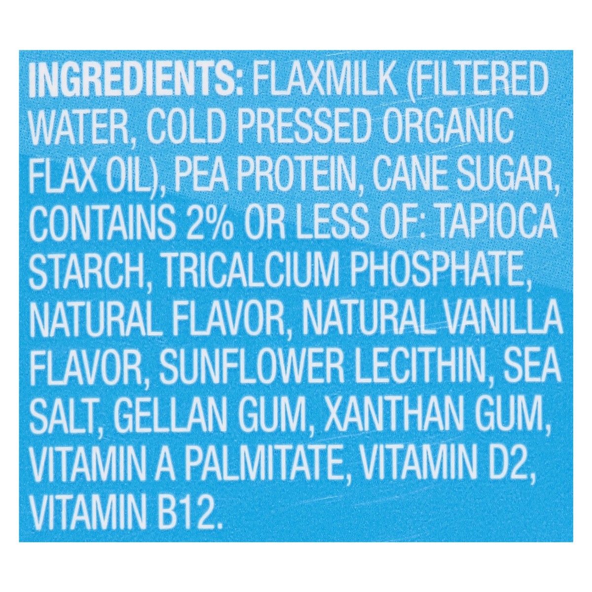 Flaxmilk (Filtered Water, Cold Pressed Organic Flax Oil), Pea Protein, Cane Sugar, Contains 2% or Less of: Tapioca Starch, Tricalcium Phosphate, Natural Flavor, Natural Vanilla Flavor, Sunflower Lecit…