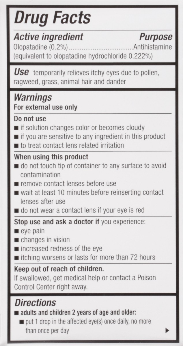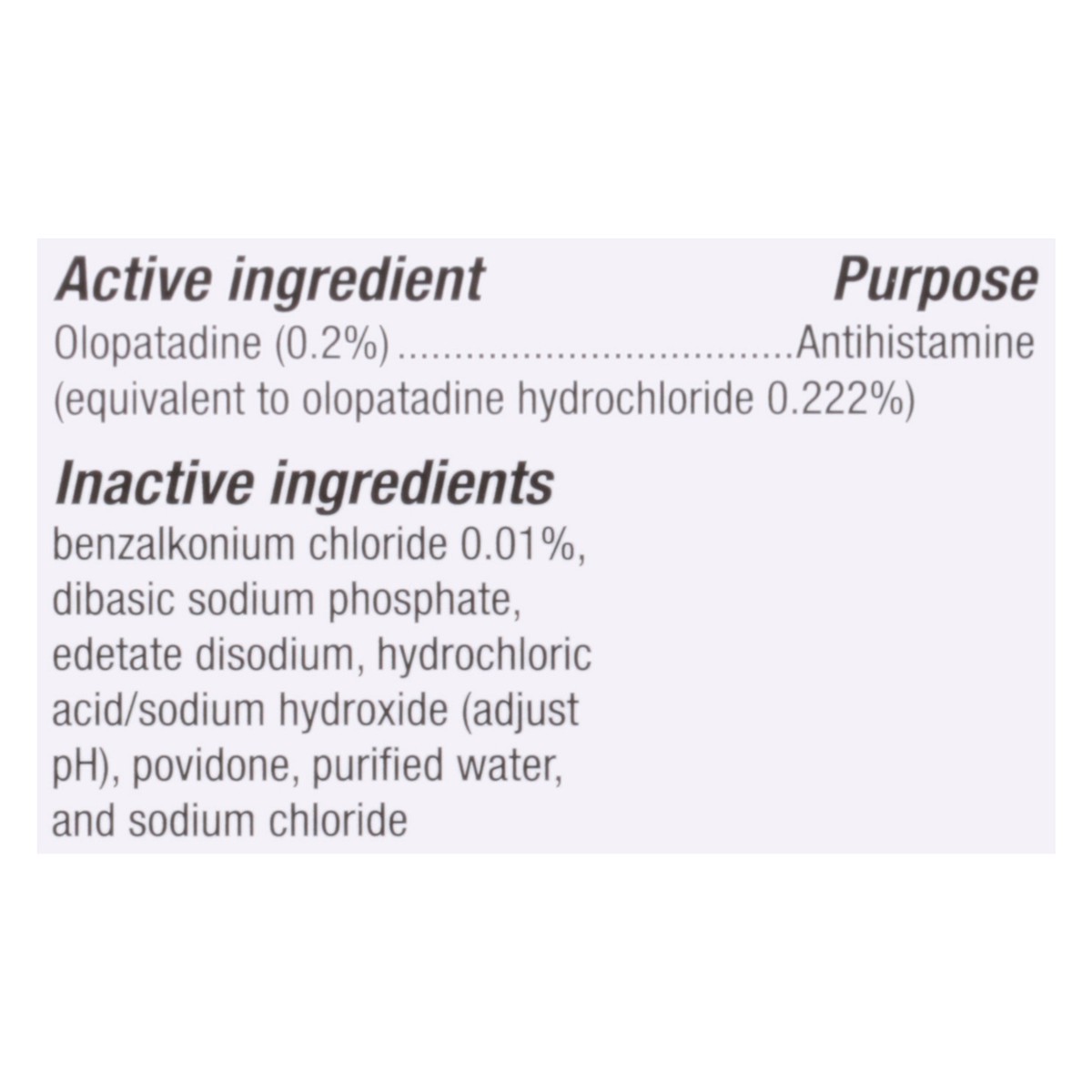 Active Ingredients: Olopatadine (Equivalent to Olopatadine Hydrochloride 0.222%) (0.2 %), Antihistamine. Inactive Ingredients: Benzalkonium Chloride 0.01%, Dibasic Sodium Phosphate, Edetate Disodium, …