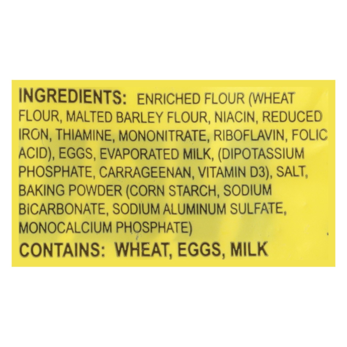 Enriched Flour (Wheat Flour, Malted Barley Flour, Niacin, Reduced Iron, Thiamine, Mononitrate, Riboflavin, Folic Acid), Eggs, Evaporated Milk, (Dipotassium Phosphate, Carrageenan, Vitamin D3), Salt, B…