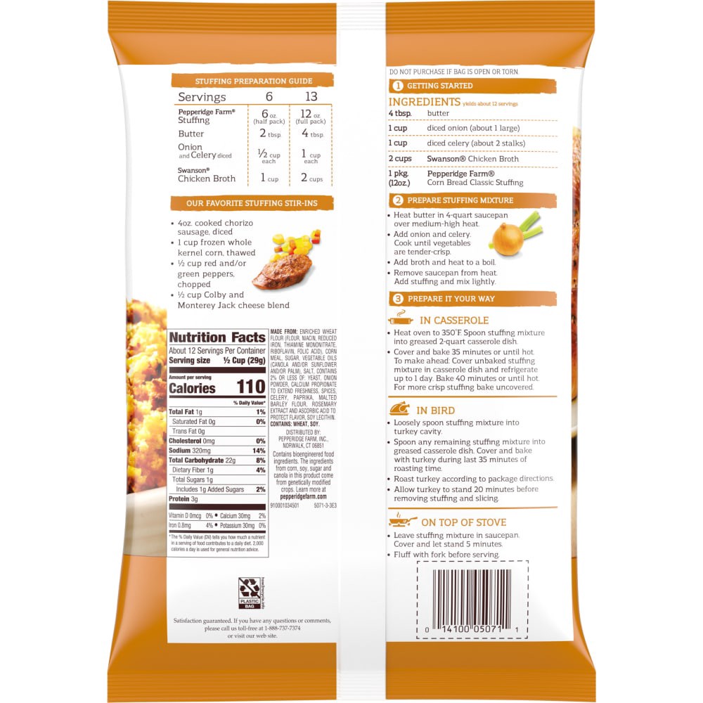 For holiday meals or everyday dinners, enjoy Pepperidge Farm Corn Bread Stuffing - made from our premium cornbread and perfectly seasoned to create a gratifyingly delicious side dish! Follow our instr…