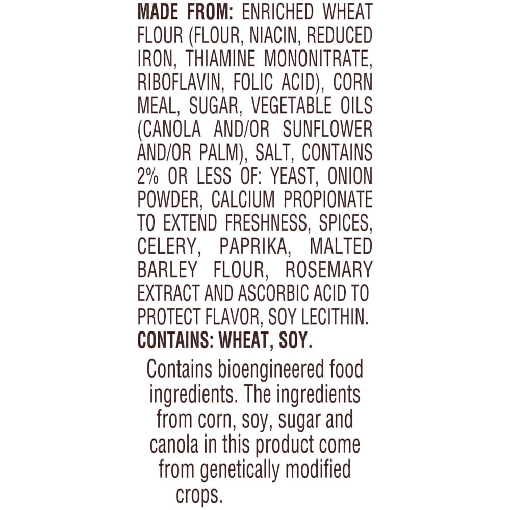 MADE FROM: ENRICHED WHEAT FLOUR (FLOUR, NIACIN, REDUCED IRON, THIAMINE MONONITRATE, RIBOFLAVIN, FOLIC ACID), CORN MEAL, SUGAR, VEGETABLE OILS (CANOLA AND/OR SUNFLOWER AND/OR PALM), SALT, CONTAINS 2% O…