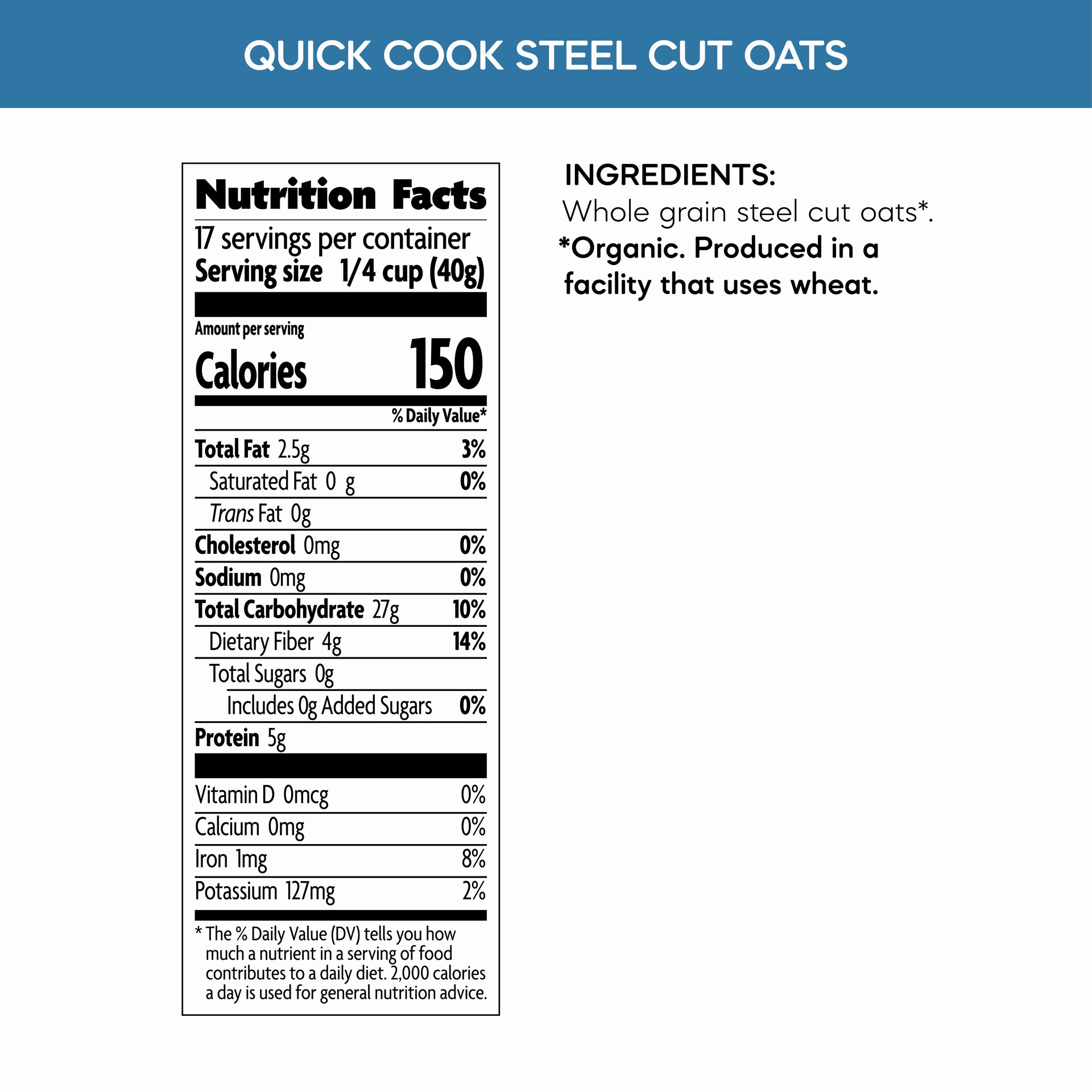 A re-sealable canister of organic quick cooking, steel cut oats. Quick Cook Steel Cut Oats are steel cut oats that have been cut extra small, so you get the hearty texture of steel cut oats, without h…