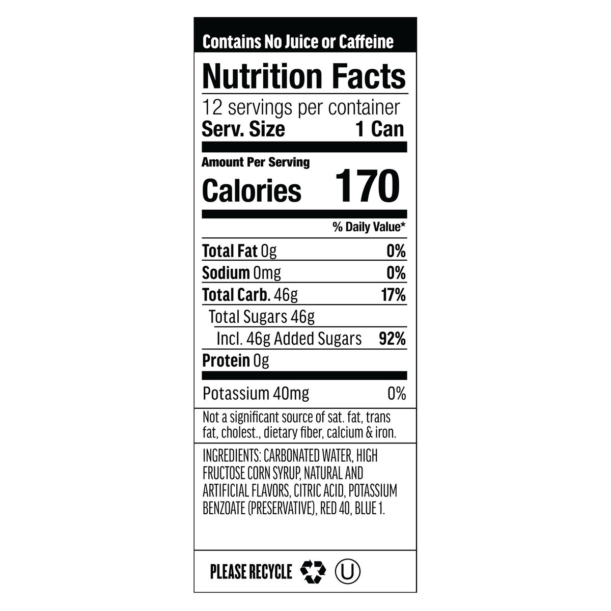 Carbonated Water, High Fructose Corn Syrup, Natural and Artificial Flavors, Citric Acid, Potassium Benzoate (Preservative), Red 40, Blue 1.
