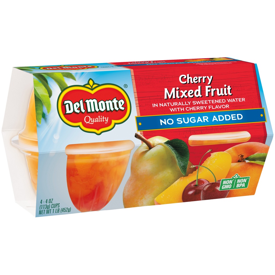 DEL MONTE Cherry Flavored Mixed Fruit Cups contain bite-sized pieces of peaches, pear and cherries, conveniently packaged in easy-to-open individual fruit cups for quick, on the go fruit snack. Each o…