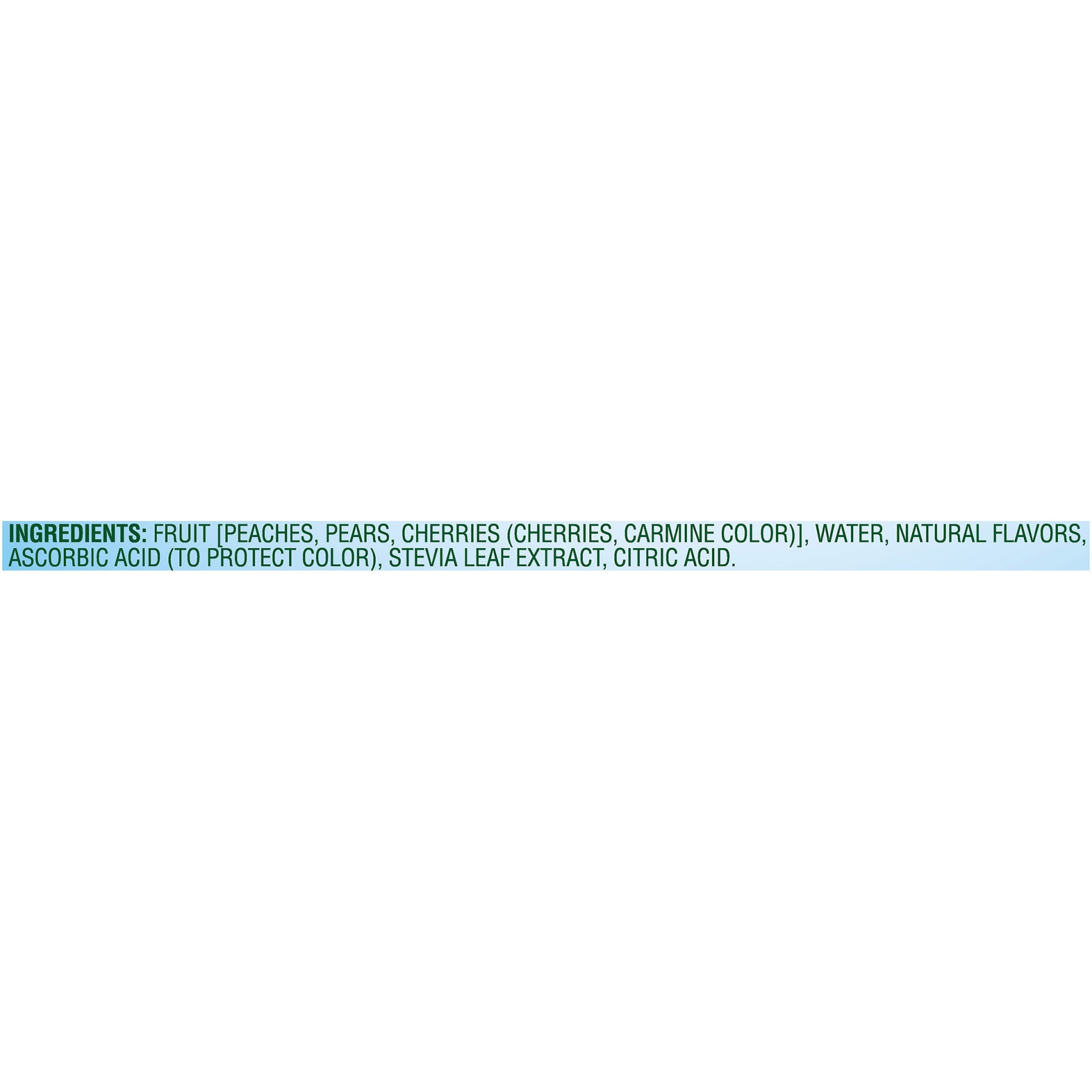 Fruit (Peaches, Pears, Cherries [Cherries, Red 3]), Water, Ascorbic Acid, Natural Flavor, Stevia Leaf Extract, Citric Acid.
