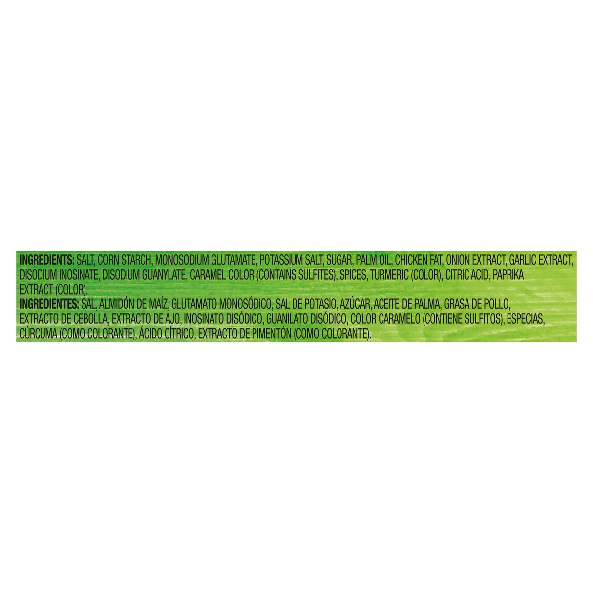 Salt, Corn Starch, Monosodium Glutamate, Potassium Salt, Sugar, Palm Oil, Chicken Fat, Onion Extract, Garlic Extract, Disodium Inosinate, Disodium Guanylate, Caramel Color (Contains Sulfites), Spices,…