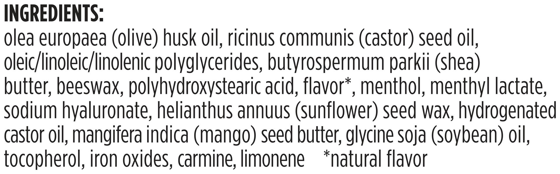 olea europaea (olive) husk oil, ricinus communis (castor) seed oil, oleic/linoleic/linolenic polyglycerides, butyrospermum parkii (shea) butter, beeswax, polyhydroxystearic acid, flavor*, menthol, men…