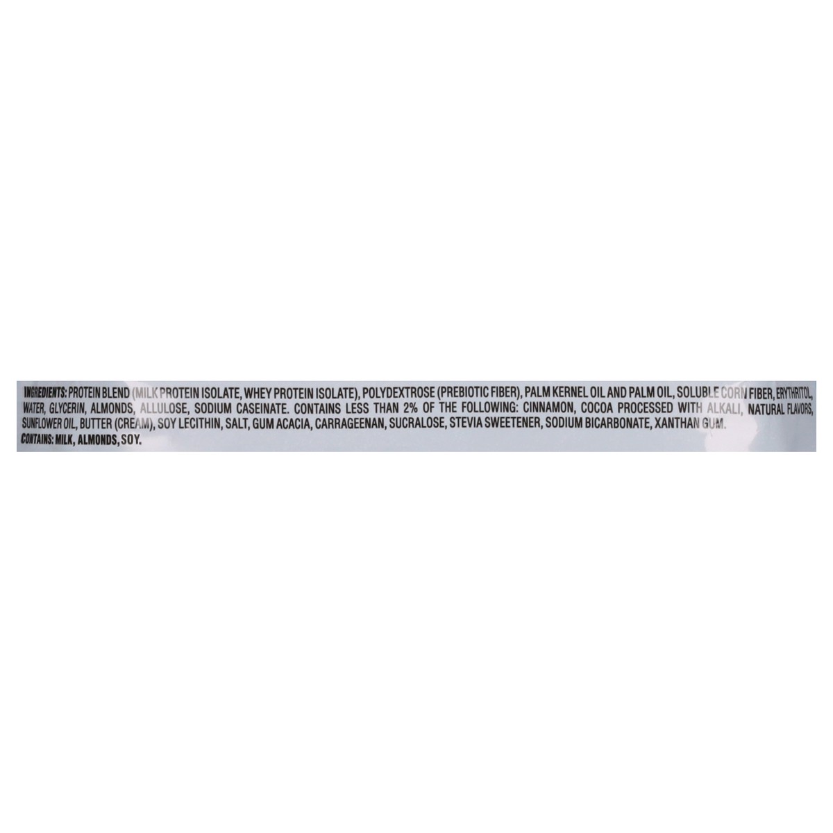 Protein Blend (Milk Protein Isolate, Whey Protein Isolate), Polydextrose (Prebiotic Fiber), Palm Kernel Oil and Palm Oil, Soluble Corn Fiber, Erythritol, Water, Glycerin, Almonds, Allulose, Sodium Cas…