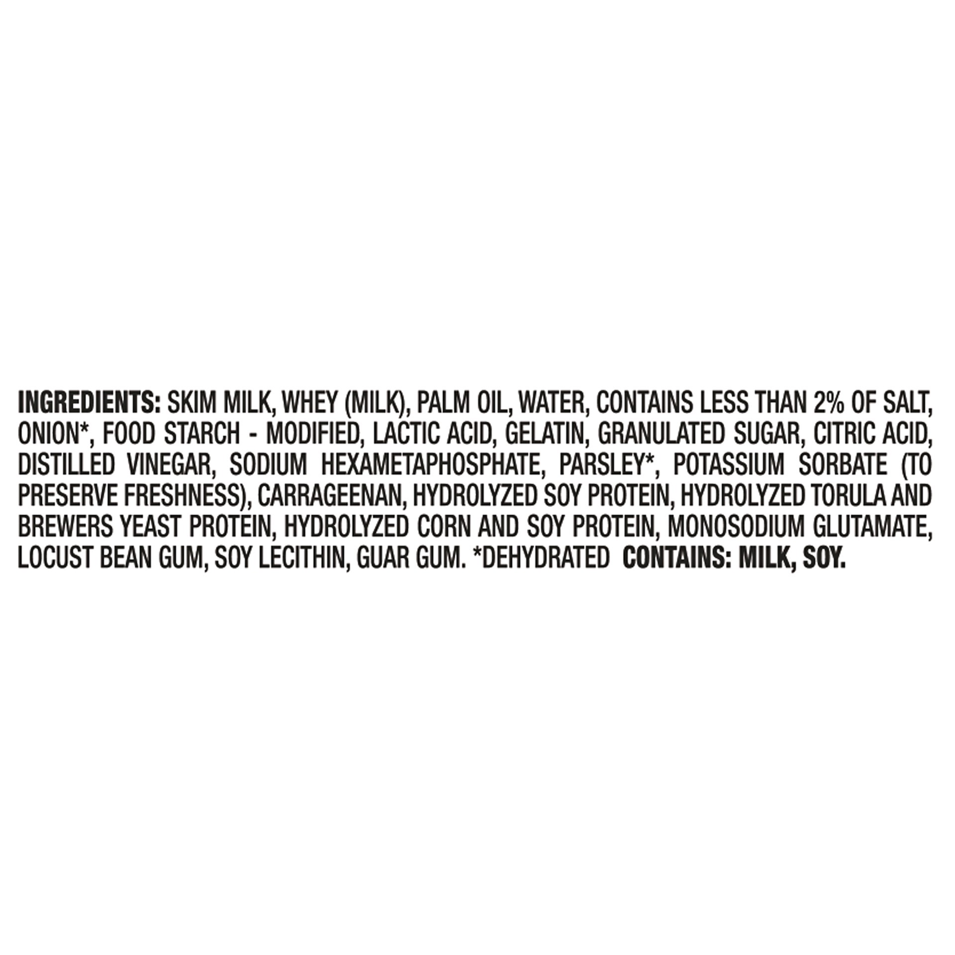 SKIM MILK, WHEY (MILK), PALM OIL, WATER, CONTAINS LESS THAN 2% OF SALT, ONION*, FOOD STARCH - MODIFIED, LACTIC ACID, GELATIN, GRANULATED SUGAR, CITRIC ACID, DISTILLED VINEGAR, SODIUM HEXAMETAPHOSPHATE…