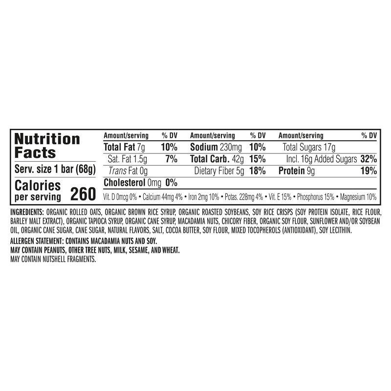 Organic Rolled Oats, Organic Brown Rice Syrup, Soy Rice Crisps (Soy Protein Isolate, Rice Flour, Barley Malt Extract), Organic Roasted Soybeans, Organic Tapioca Syrup, Macadamia Nuts, Chicory Root Fib…
