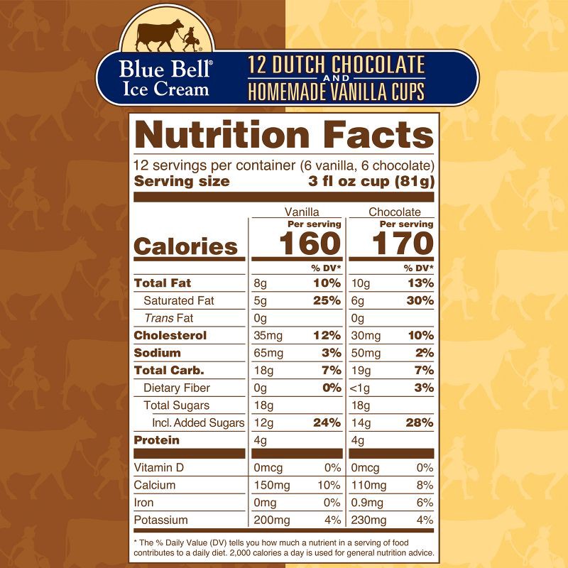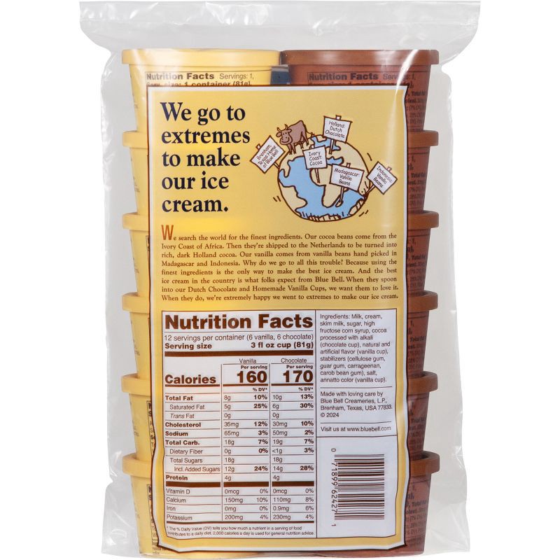 - One bag of Blue Bell Dutch Chocolate and Homemade Vanilla Ice Cream Cups contains 12 individual 3 fl oz (88 mL) cups