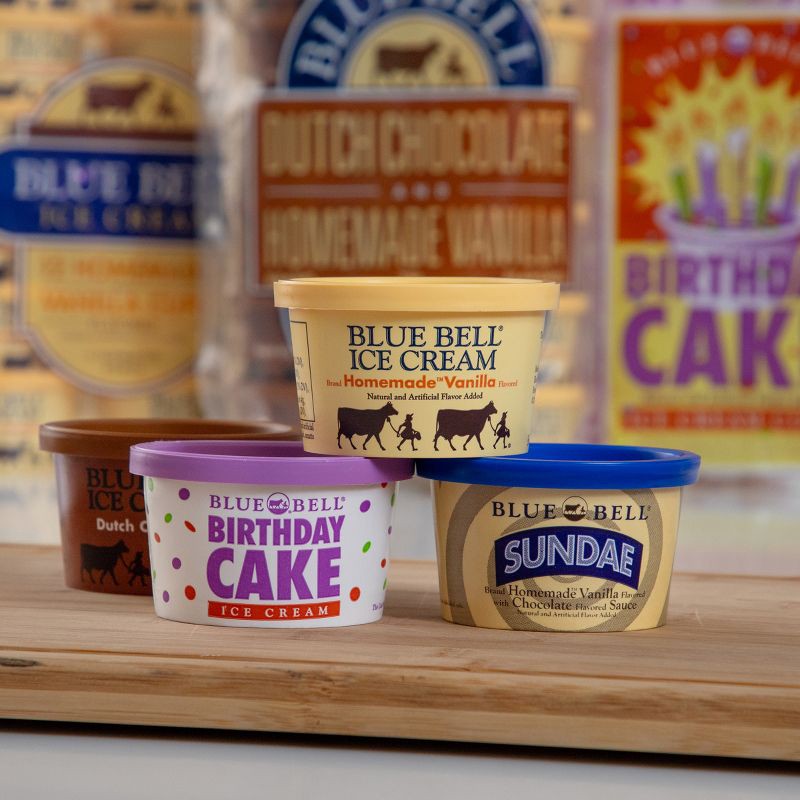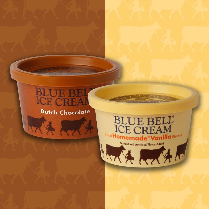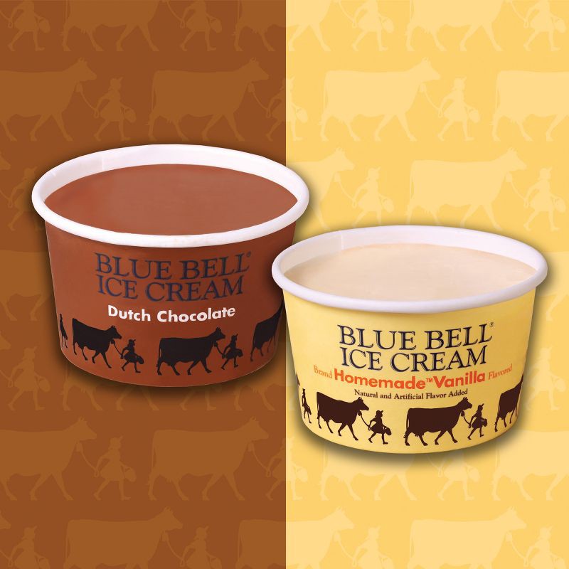 - Two best-selling Blue Bell Ice Cream flavors, Homemade Vanilla and Dutch Chocolate, six cups of each, packaged side-by-side in one bag