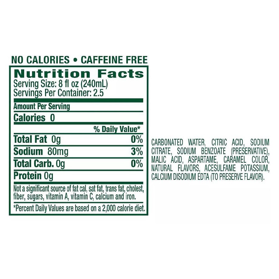Carbonated Water and Less than 2% of: Ginger Extract, Natural Flavors, Citric Acid, Malic Acid, Sodium Citrate, Sodium Benzoate (Preservative), Calcium Disodium EDTA (to Protect Flavor), Aspartame, Ac…
