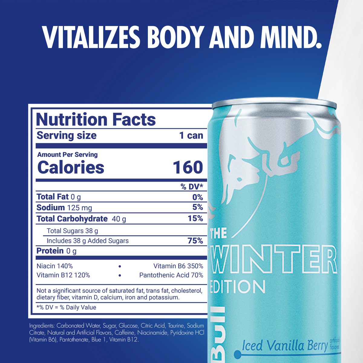 - Enjoy the taste of Blueberry, Vanilla, and icy-fresh notes of eucalyptus in the Red Bull Winter Edition; Features taurine, an amino acid, plus four essential B-group vitamins B3, B6, B12 and B5, which contribute to normal energy-yielding metabolism