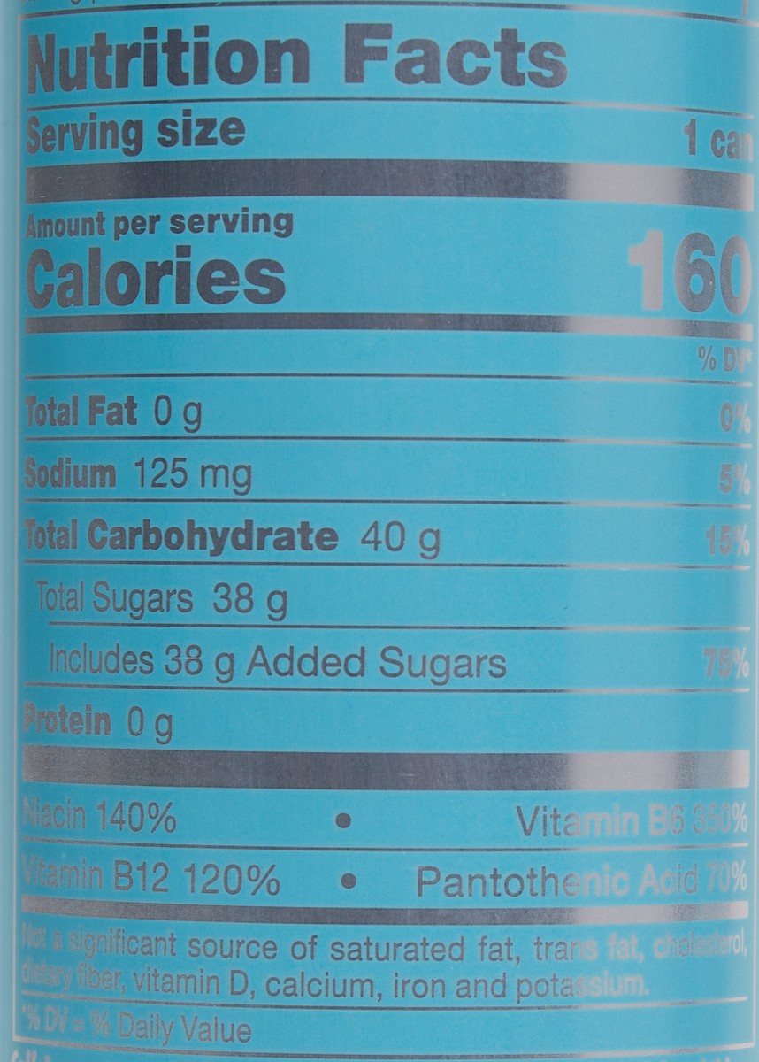 Carbonated Water, Sugar, Glucose, Citric Acid, Taurine, Sodium Citrate, Natural and Artificial Flavors, Caffeine, Color, Niacinamide, Pyridoxine HCl (Vitamin B6), Calcium Pantothenate, Blue 1, Vitamin…