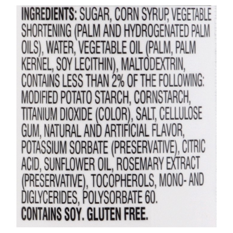 Sugar, Corn Syrup, Vegetable Shortening (Palm and Hydrogenated Palm Oils), Water, Vegetable Oil (Palm, Palm Kernel, Soy Lecithin), Maltodextrin, Contains Less than 2% of the Following: Modified Potato…