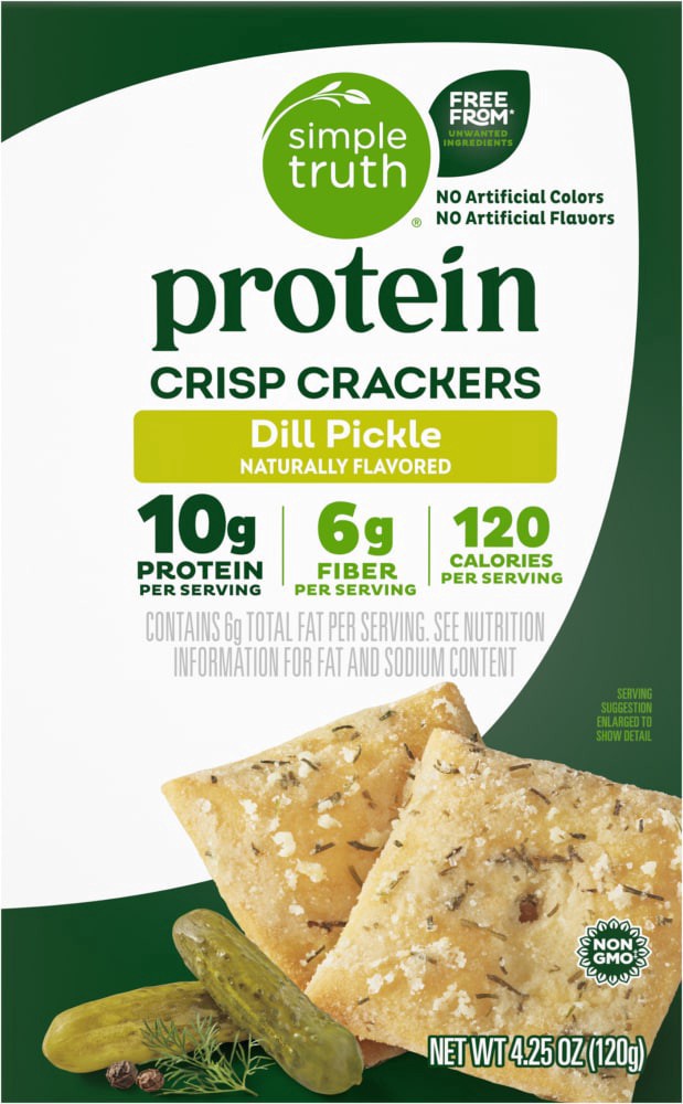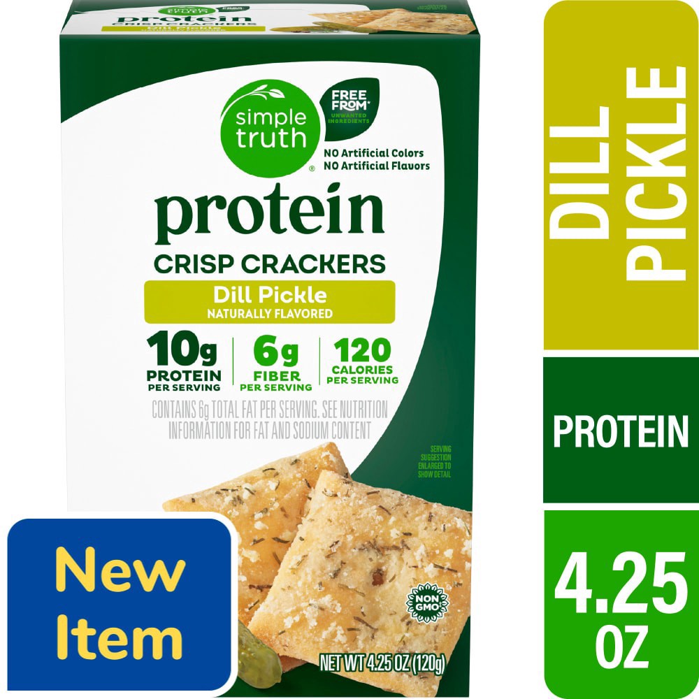 Simple Truth® Protein Dill Pickle Crisp Crackers are a fantastic snacking option with 10g of protein and 6g of fiber per serving. Non-GMO, these delicious dill pickle crisp crackers contain no artific…