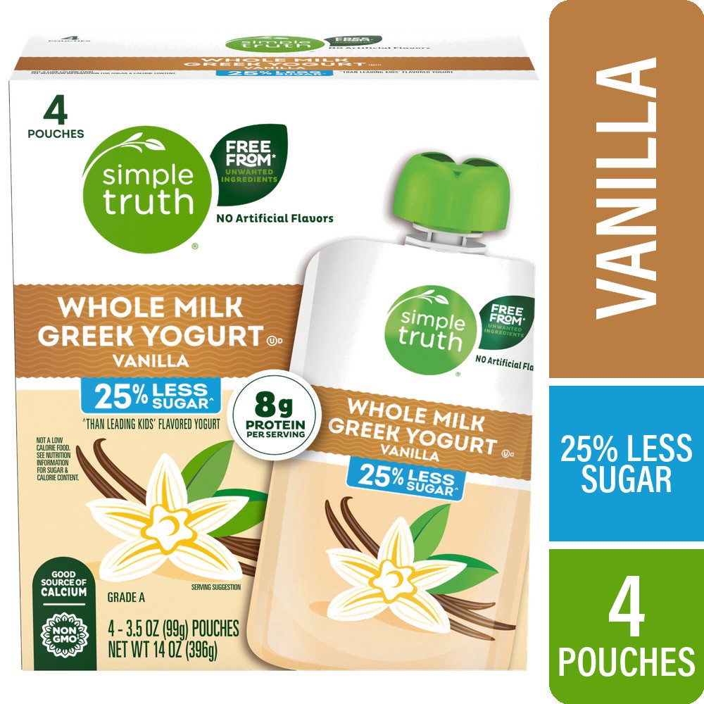 Simple Truth® Vanilla Whole Milk Greek Yogurt Pouches pack the delicious taste of cultured grade A whole milk, natural flavor, and 25% less sugarˆ. This good source of calcium is non-GMO with 8g prote…