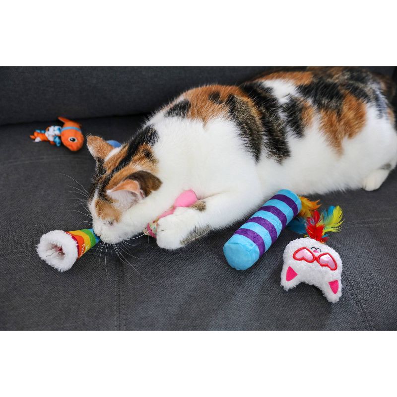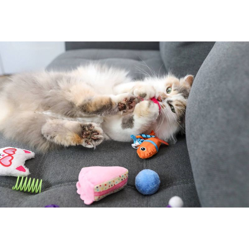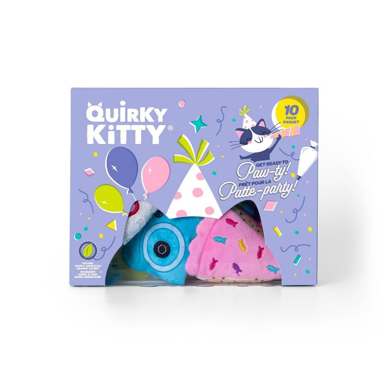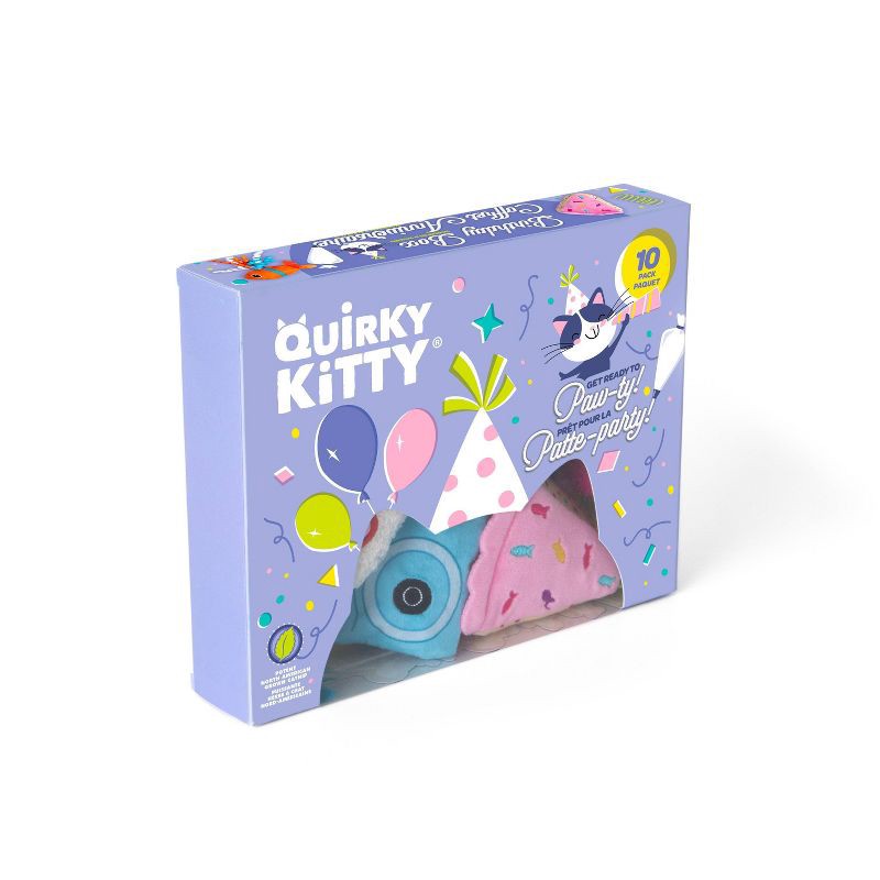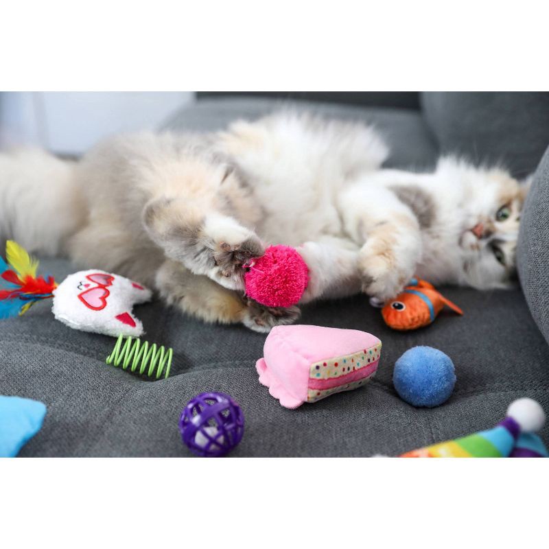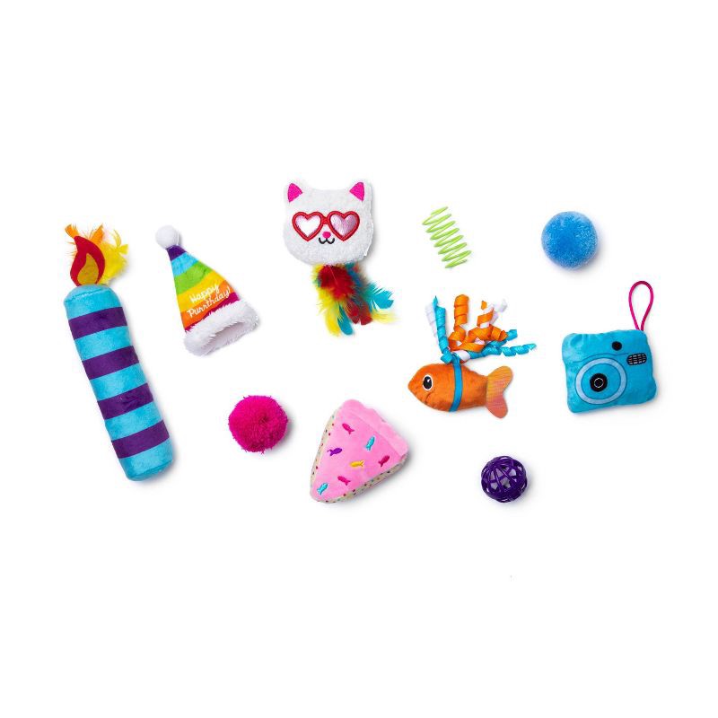 - Celebrate with a party pack of ten playful toys to bat and chase!