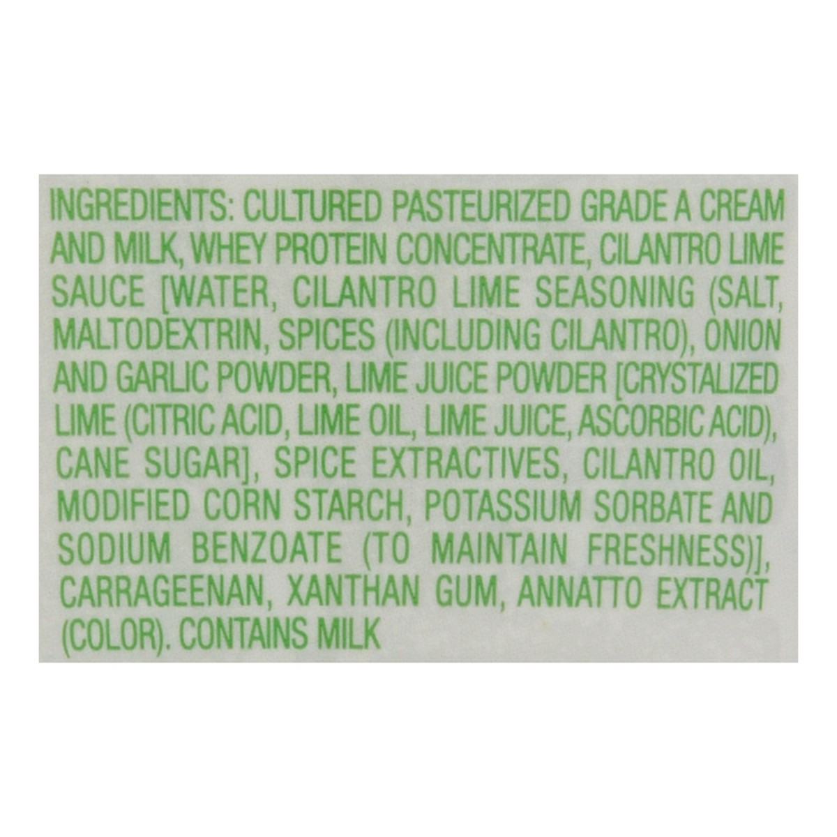 Cultured Pasteurized Grade A Cream and Milk, Whey Protein Concentrate, Cilantro Lime Sauce [Water, Cilantro Lime Seasoning Blend (Salt, Maltodextrin, Spices (Including Cilantro), Onion and Garlic Powd…