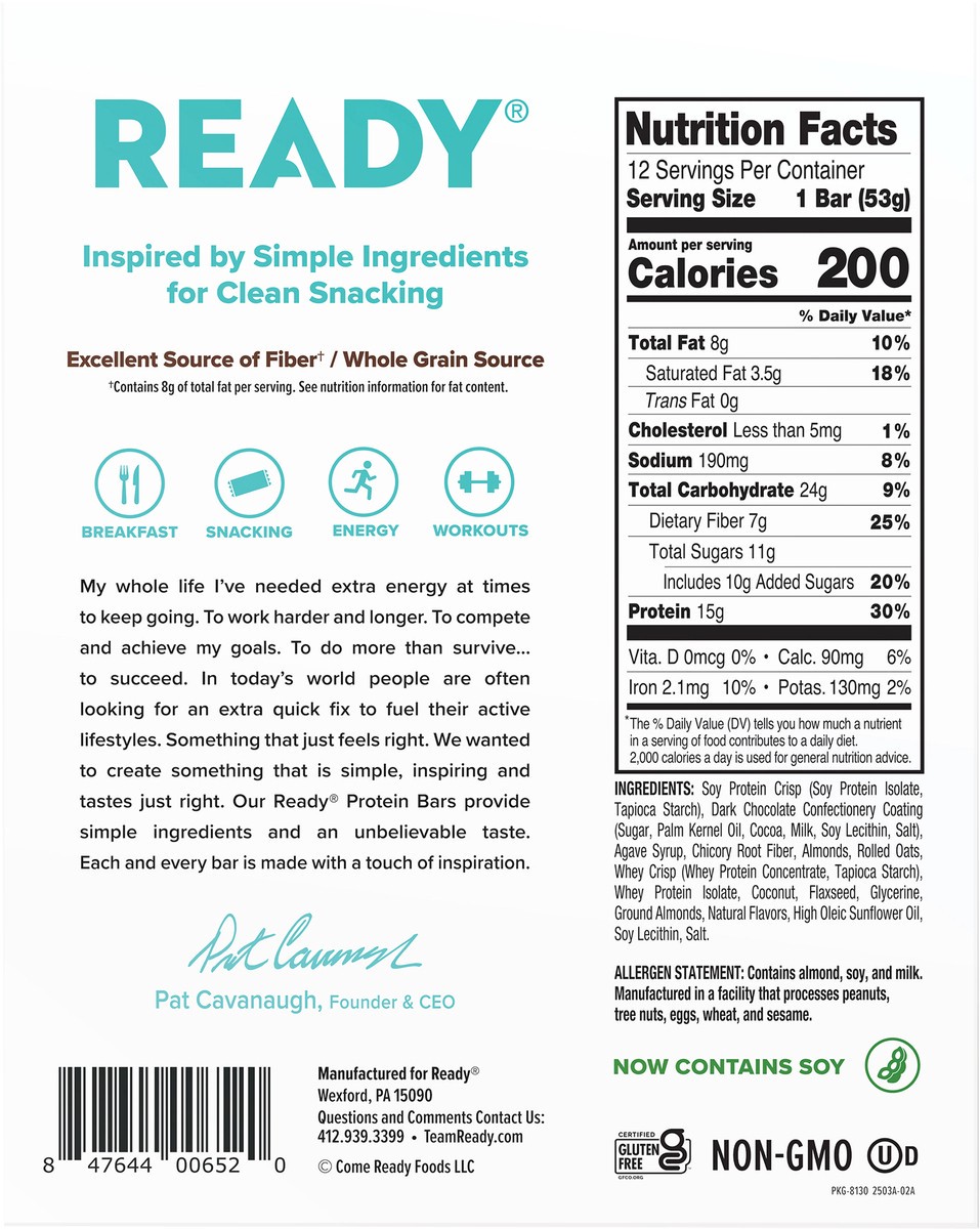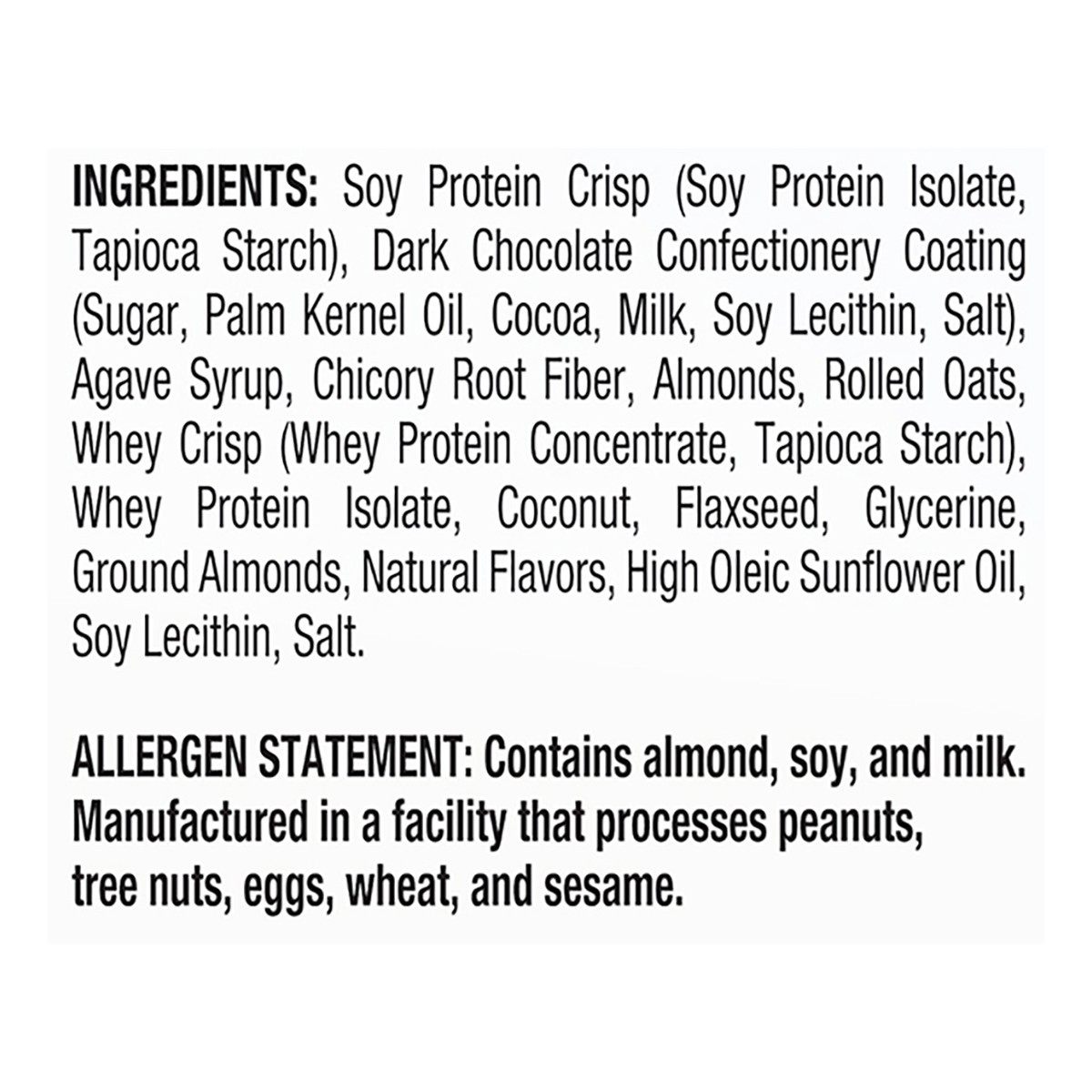 Soy Protein Crisp (Soy Protein Isolate, Tapioca Starch), Dark Chocolate Confectionery Coating (Sugar, Palm Kernel Oil, Cocoa, Milk, Soy Lecithin, Salt), Agave Syrup, Chicory Root Fiber, Almonds, Rolleā¦