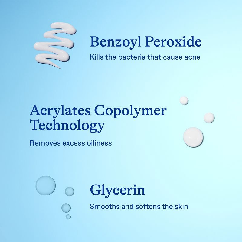 - FORMULATED WITH GLYCERIN: While benzoyl peroxide starts clearing acne blemishes, glycerin helps to minimize dryness
