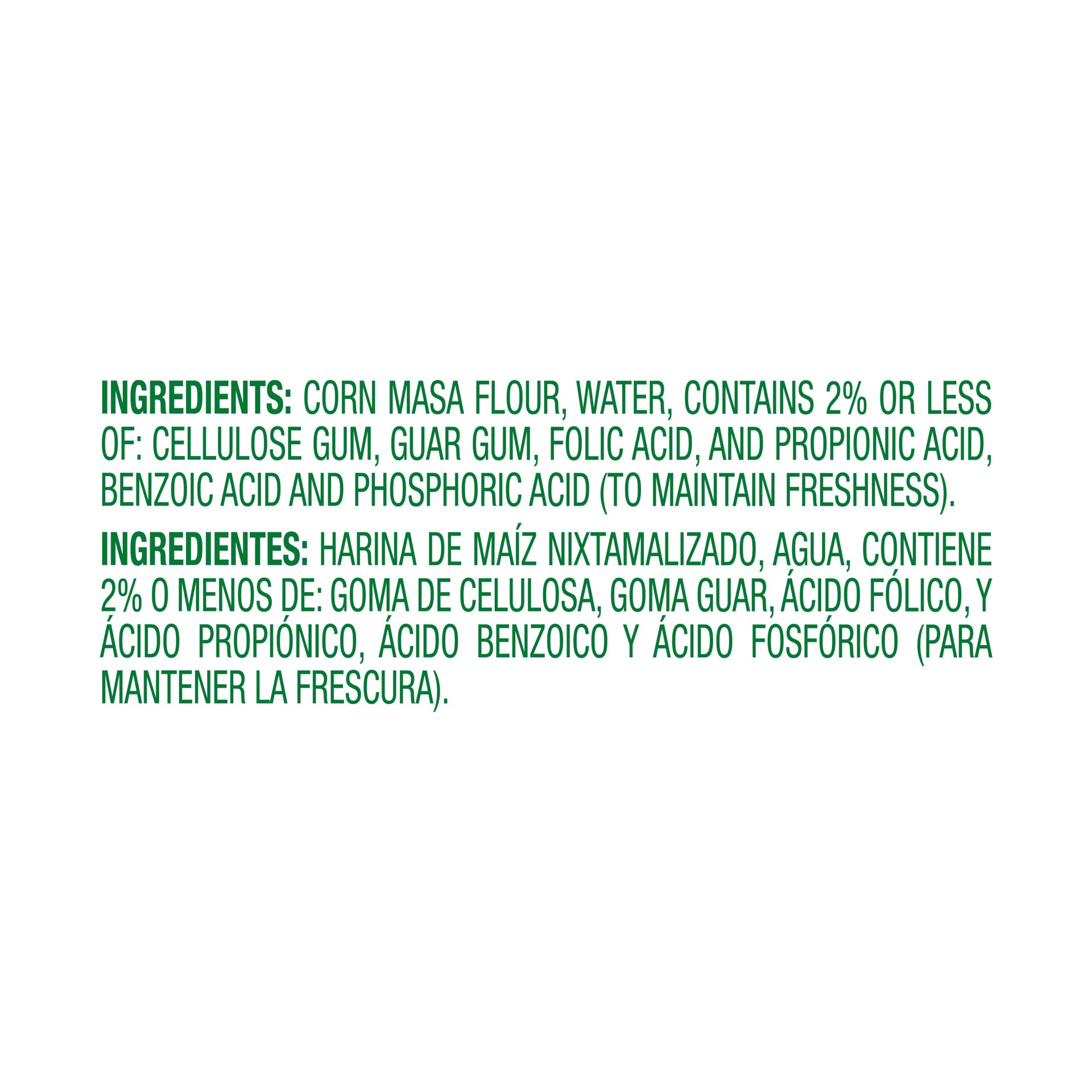 Corn Masa Flour, Water, Contains 2% Or Less Of: Cellulose Gum, Guar Gum, Enzyme, And Propionic Acid, Benzoic Acid And Phosphoric Acid (To Maintain Freshness).