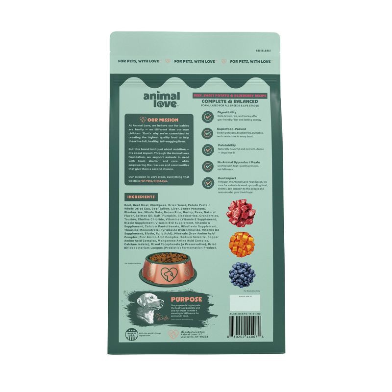 Animal Love High Protein Dry Dog Food with Real Beef, Sweet Potato, and Blueberry - 5lbs