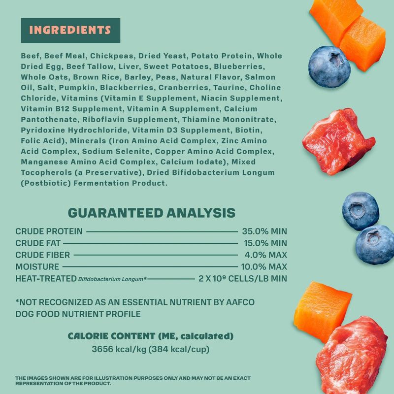 - High Protein: Real beef as the first ingredient, along with liver and egg to contribute to at least 35% protein per serving to support strong muscles in active adult dogs