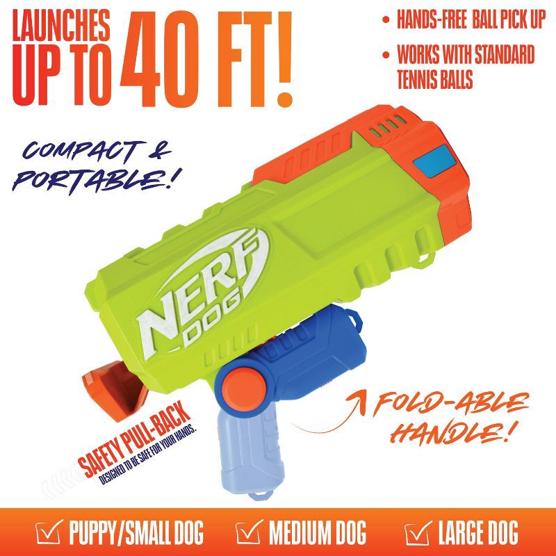 Ready, aim, and fetch! Fire away with the Nerf Dog 10inch Foldable Compact Blaster, and watch your dog enjoy the chase. The high-powered action launches your dog's favorite fetching balls up to 40ft, …