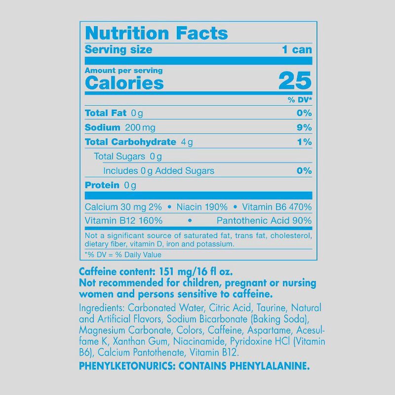 Carbonated Water, Citric Acid, Taurine, Natural and Artificial Flavors, Sodium Bicarbonate (Baking Soda), Magnesium Carbonate, Colors, Caffeine, Aspartame, Acesulfame K, Xanthan Gum, Niacinamide, Pyri…