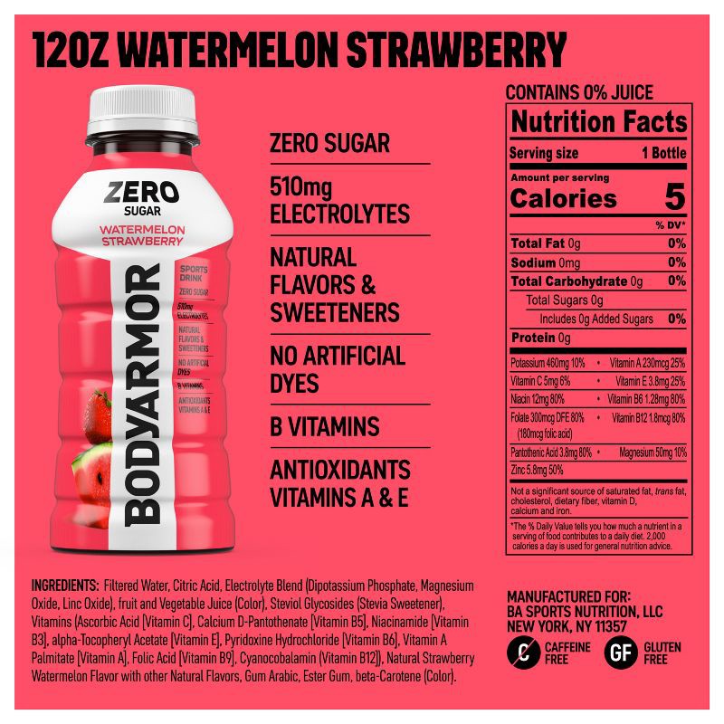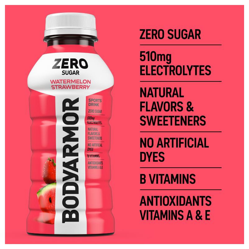 BODYARMOR Zero Sugar Sports Drink Watermelon Strawberry. This sports drink provides real hydration with zero sugar and zero grams of carbs. Whether you're preparing for a workout, pushing through a to…