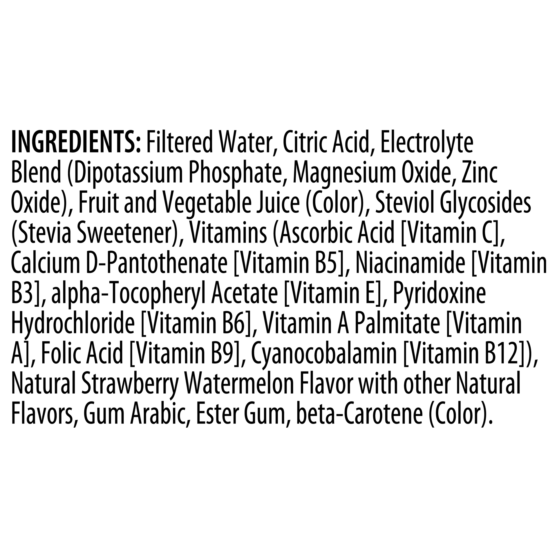 Filtered Water, Citric Acid, Electrolyte Blend (Dipotassium Phosphate, Magnesium Oxide, Zinc Oxide), Fruit And Vegetable Juice (Color), Steviol Glycosides (Stevia Sweetener), Vitamins (Ascorbic Acid […