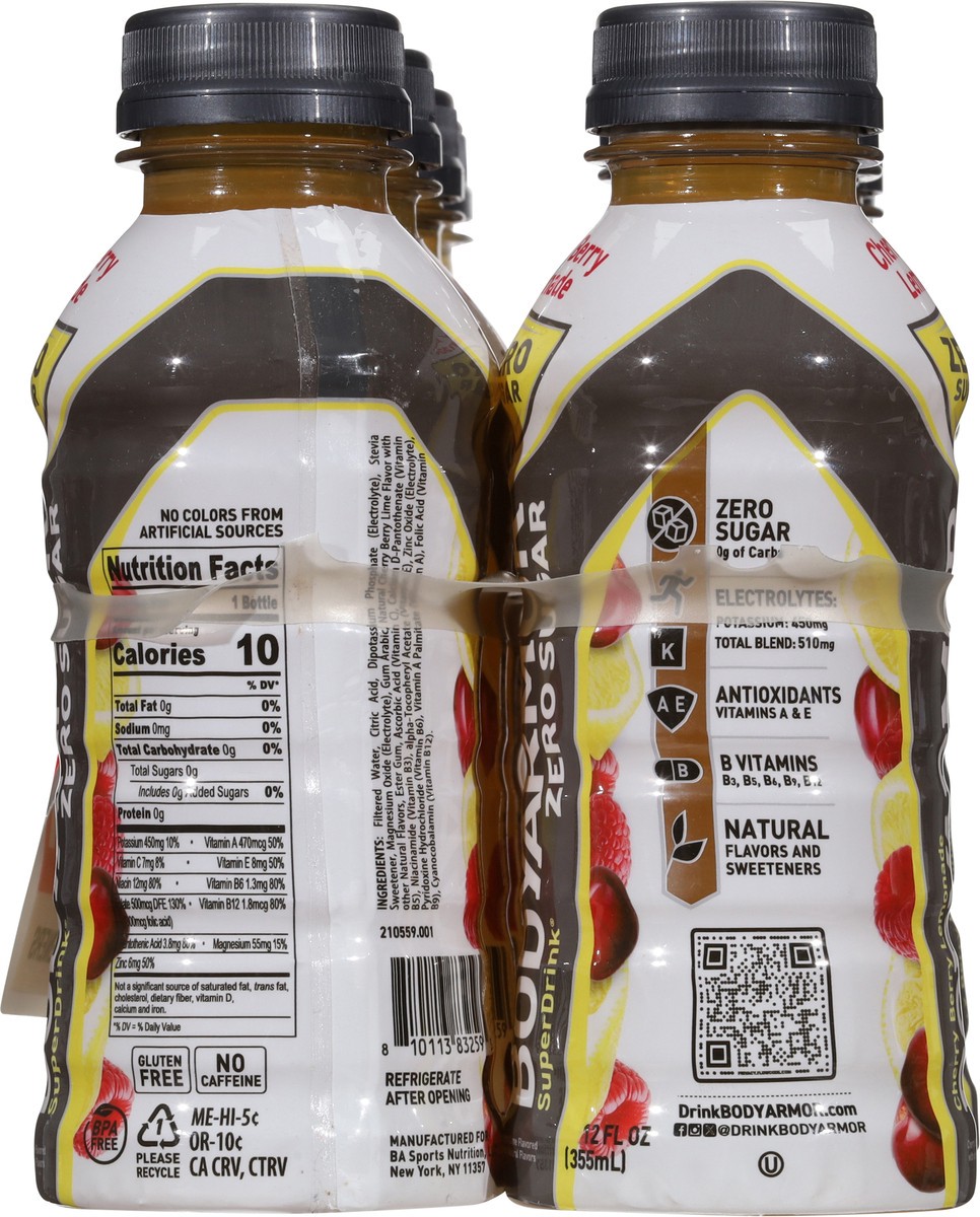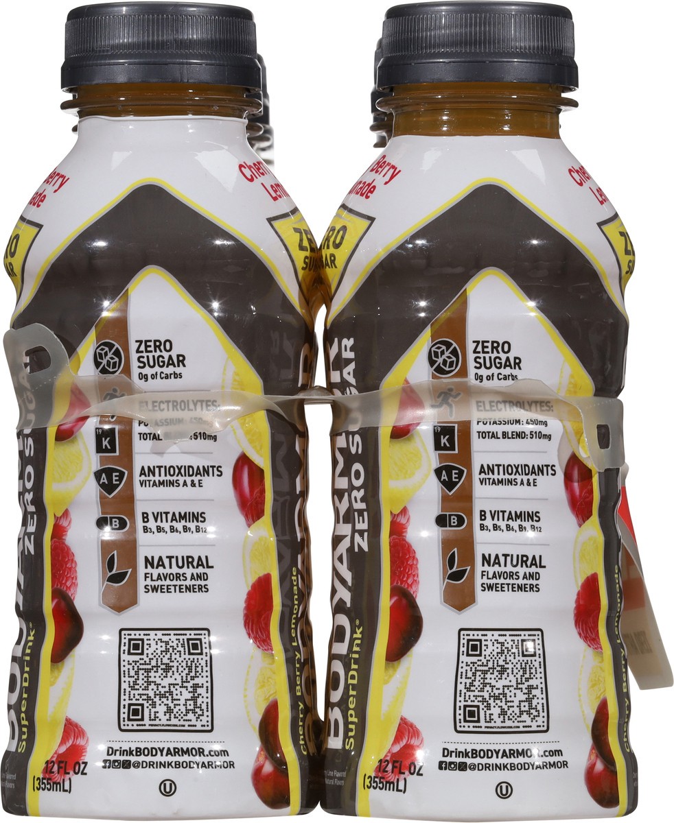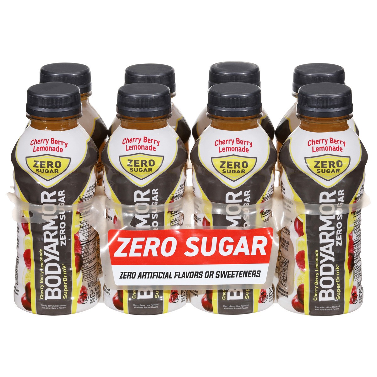 BODYARMOR Zero Sugar Sports Drink Cherry Berry Lemonade. This sports drink provides real hydration with zero sugar and zero grams of carbs. Whether you're preparing for a workout, pushing through a to…