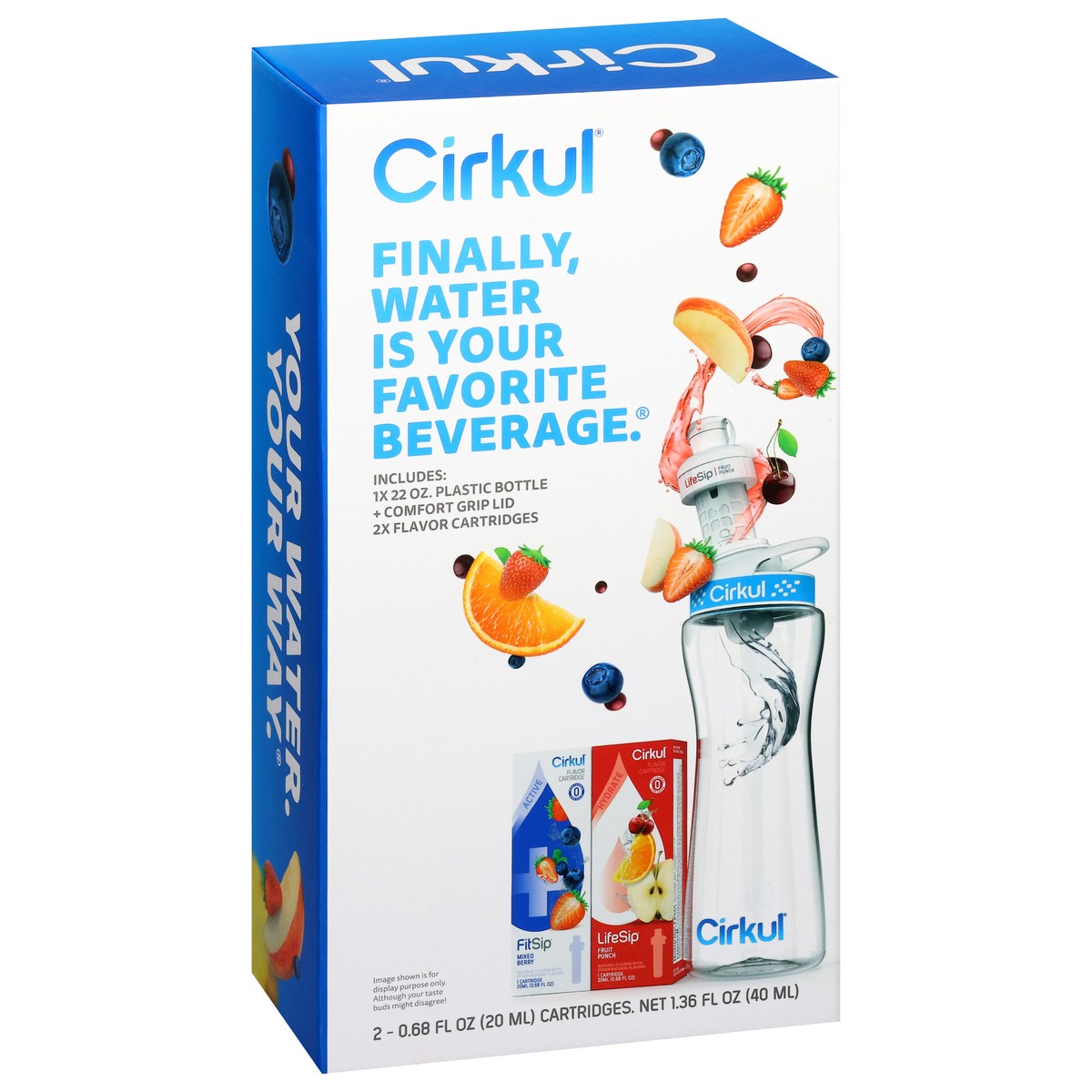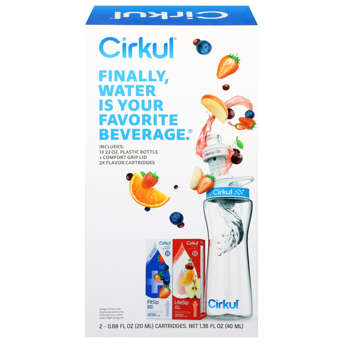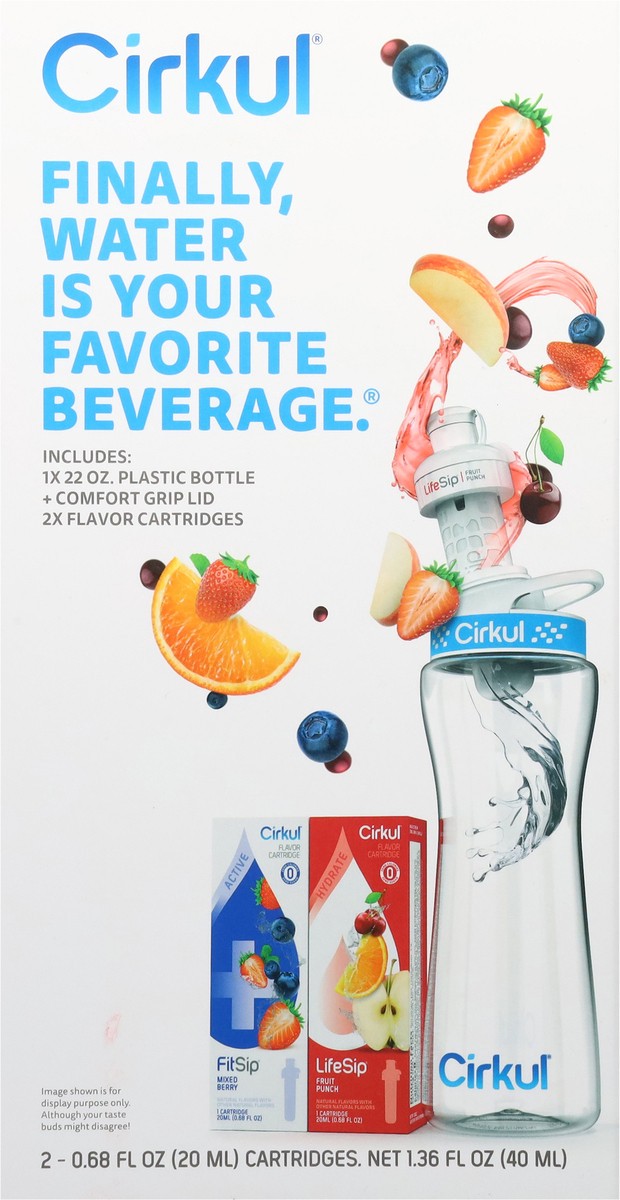 This Starter Kit is the perfect way to get started with Cirkul. Each box includes one 22oz Plastic Water Bottle, a Blue Comfort-Grip Lid, and 2 flavor cartridges that are great for adding refreshing f…