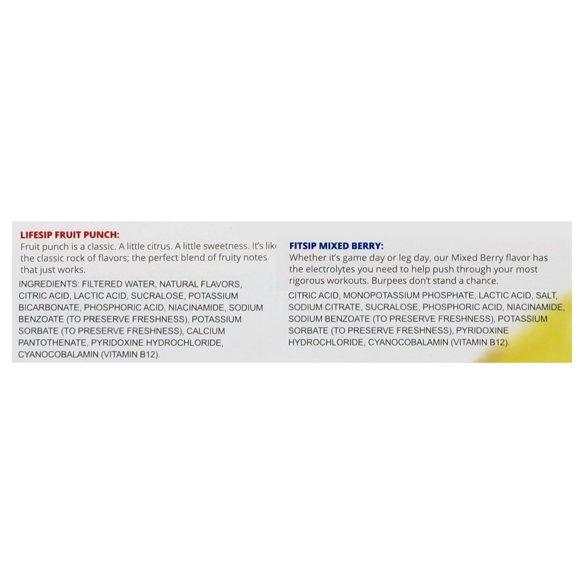 Lifesip Fruit Punch: Filtered Water, Natural Flavors, Citric Acid, Lactic Acid, Sucralose, Potassium Bicarbonate, Phosphoric Acid, Niacinamide, Sodium Benzoate (to Preserve Freshness), Potassium Sorba…