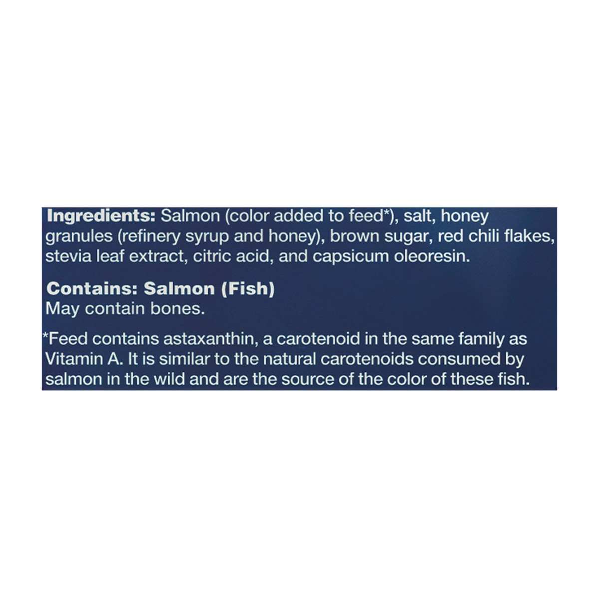 Salmon (Color Added to Feed*), Salt, Honey Granules (Refinery Syrup and Honey), Brown Sugar, Red Chili Flakes, Stevia Leaf Extract, Citric Acid, and Capsicum Oleoresin. * Feed Contains Astaxanthin, a …