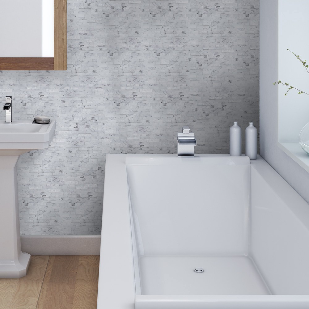 Peel & Stick natural stone mosaic tiles are durable and feature a strong adhesive backing that is created to last for years. This stacked carrara stone mosaic tile provides an stylish look to your spa…