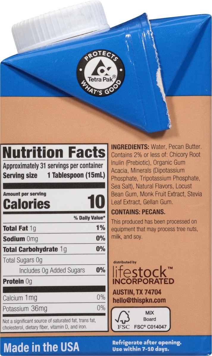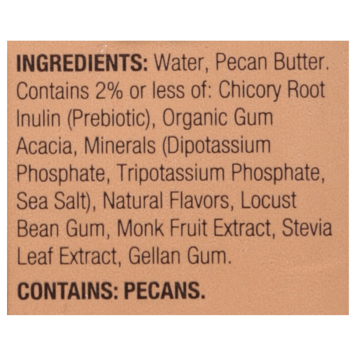 Water, Pecan Butter, Contains 2% or Less of: Chicory Root Inulin (Prebiotic), Organic Gum Acacia, Minerals (Dipotassium Phosphate, Tripotassium Phosphate, Sea Salt), Natural Flavors, Locust Bean Gum, …