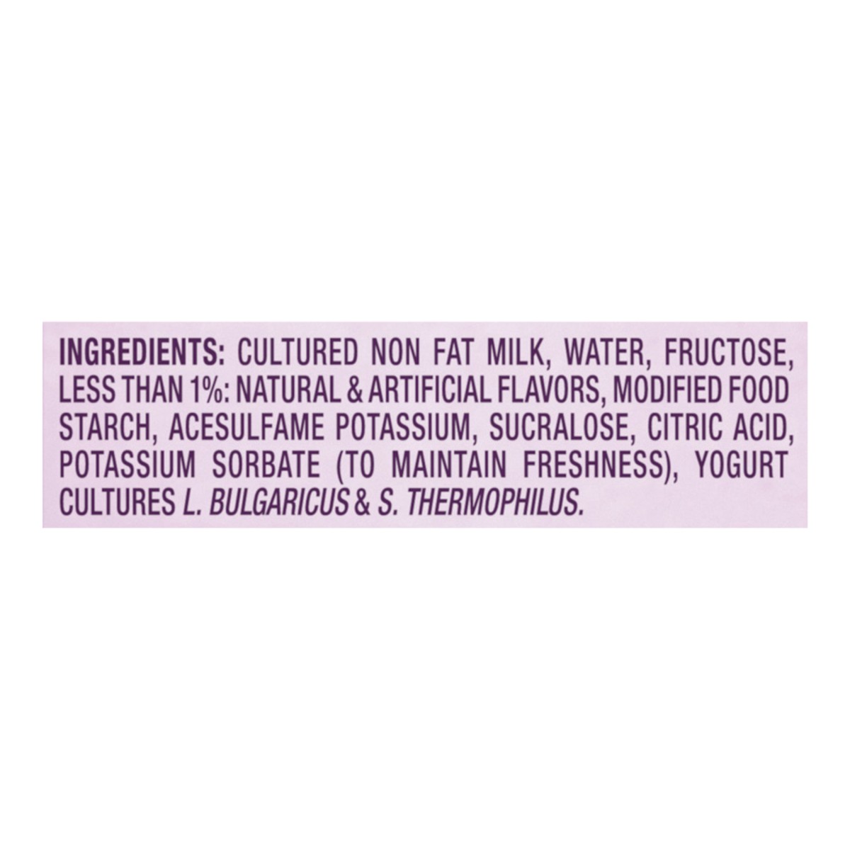 CULTURED PASTEURIZED NON FAT MILK, WATER, FRUCTOSE, LESS THAN 1%: NATURAL & ARTIFICIAL FLAVORS, MODIFIED FOOD STARCH, ACESULFAME POTASSIUM, SUCRALOSE, CITRIC ACID, POTASSIUM SORBATE (TO MAINTAIN F…