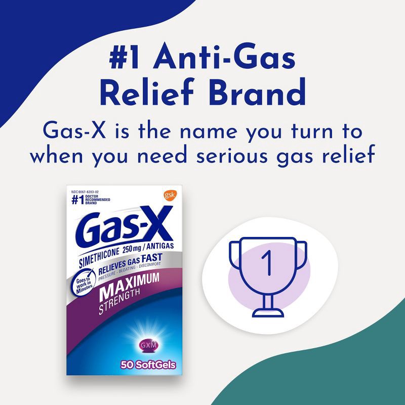 - One 50 ct package of Gas-X Maximum Strength Gas Relief Softgels with Simethicone 250 mgGas-X simethicone antigas softgels relieves gas in minutes for gas and bloating reliefGas-X gas softgels provides fast bloating and gas relief250 mg of maximum strength simethicone - the highest dose available in over-the-counter gas pillsSimethicone 250 mg gas relief softgels are portable and easy to swallowHSA and FSA eligible item. Medicare Advantage OTC (MAOTC) eligible. *OTC benefits and eligible products vary by plan. Check your plan for specific details.