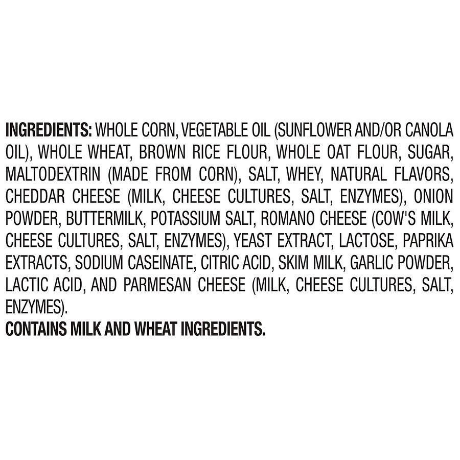 Whole Corn, Vegetable Oil (Sunflower and/or Canola Oil), Whole Wheat, Brown Rice Flour, Whole Oat Flour, Sugar, Maltodextrin (Made from Corn), Salt, Whey, Natural Flavors, Cheddar Cheese (Milk, Cheese…