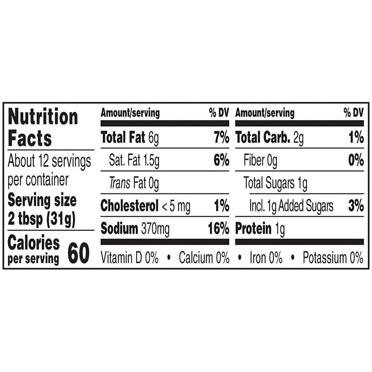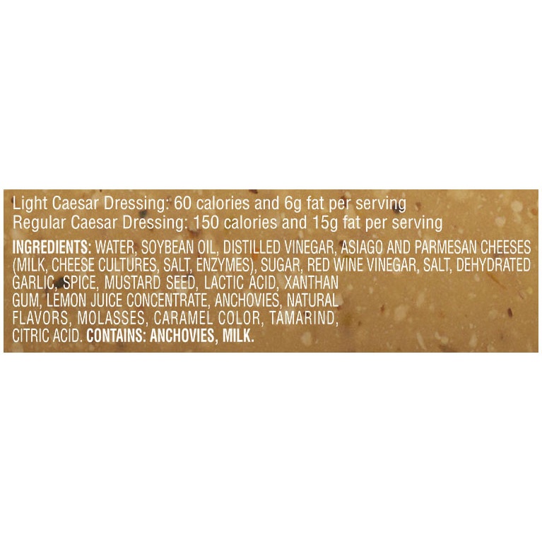Water, Soybean Oil, Distilled Vinegar, Asiago and Parmesan Cheeses (Milk, Cheese Cultures, Salt, Enzymes), Sugar, Red Wine Vinegar, Salt, Dehydrated Garlic, Spice, Mustard Seed, Lactic Acid, Xanthan G…