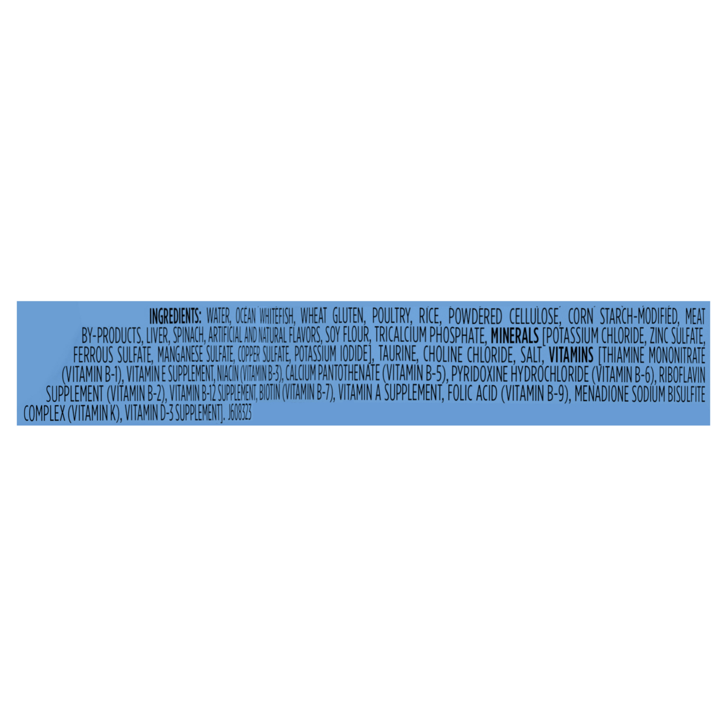 Water, Ocean Whitefish, Wheat Gluten, Poultry, Rice, Powdered Cellulose, Corn Starch-Modified, Meat By-Products, Liver, Spinach, Artificial and Natural Flavors, Soy Flour, Tricalcium Phosphate, Minera…