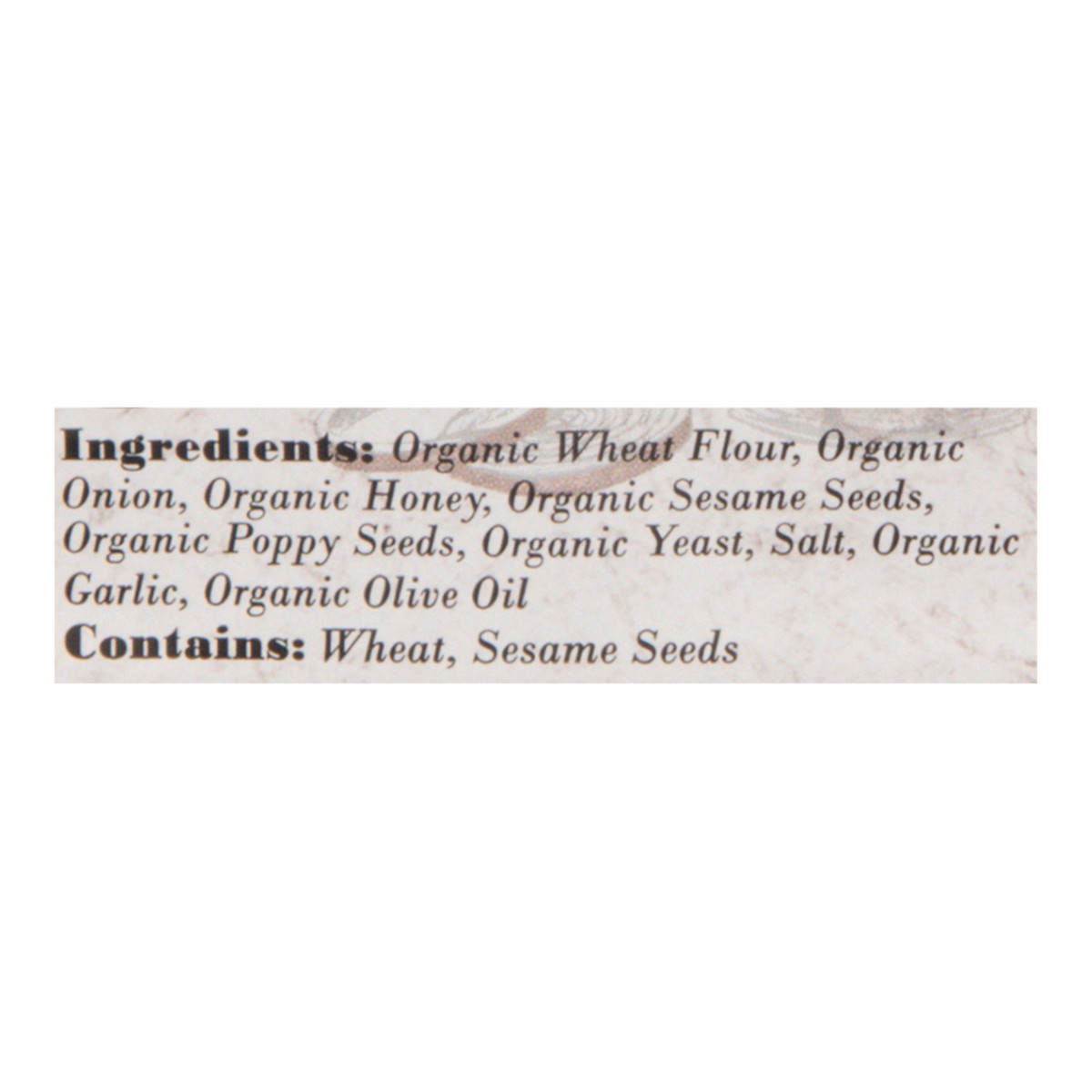 Organic Wheat Flour, Organic Onion, Organic Honey, Organic Sesame Seeds, Organic Poppy Seeds, Organic Yeast, Salt, Organic Garlic, Organic Olive Oil.