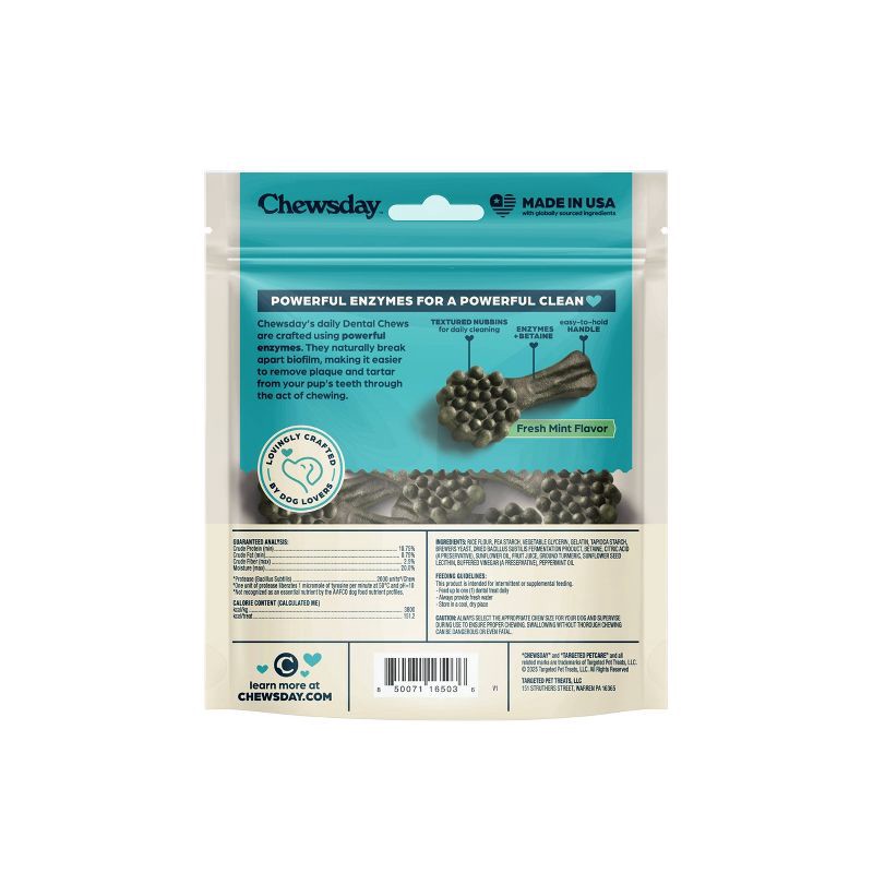 - For healthier teeth and fresher breath: Chewsday dental treats are crafted using powerful enzymes and are specially formulated to support healthy gums when used with a good oral health regimen
